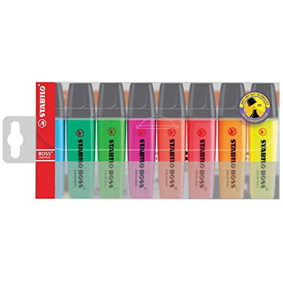 Dobrze lezy w dloni i posiada wymienne wklady. Nie martw sie, jeśli przez przypadek zapomnisz o skuwce - dzieki technologii Anti-Dry-Out STABILO BOSS ORIGINAL poradzi sobie świetnie nawet do 4 godzin bez zatyczki i nie zaschnie. Jego tusz na bazie wody jest calkowicie bezpieczny dla zdrowia.