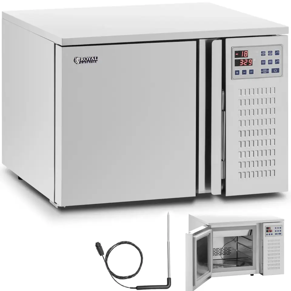 Kod producenta: 10012165Zamrażarka szokowa marki Royal Catering chłodzi oraz zamraża zarówno surową, jak i ugotowaną żywność. Wydajność mrożenia na poziomie 4/209 kg/min sprawia, że urządzenie jest niezawodnym pomocnikiem w restauracjach i kuchniach hotelowych. Dzięki kompaktowym wymiarom sprawdzi się w niewielkich lokalach i w prywatnych domach. Mała zamrażarka szokowa imponuje nie tylko efektywnością mrożenia, ale także chłodzenia od 90 do 3deg;C z wydajnością 7/86 kg/min. Przyciski na jasnym i wyraźnym wyświetlaczu LCD pozwalają wprowadzić wymagane ustawienia. Obsługa jest prosta i intuicyjna. Urządzenie ma pojemność 29,5 l. Schładzarka szokowa jest wykonana z wytrzymałej i odpornej na ścieranie stali nierdzewnej. Materiał znosi działanie czynników mechanicznych i chemicznych. To sprawia, że urządzenie jest idealne do codziennego użytku w sektorze komercyjnym i ma szczególnie długą żywotność. Ponadto obojętny biologicznie materiał spełnia wysokie wymagania higieniczne obowiązujące w gastronomii. Nie wchodzi on w reakcje z żywnością i mikroorganizmami, jest bezpieczna dla zdrowia. Zamrażarka szokowa ma moc 550 W. Czynnik chłodniczy R290 (propan) odpowiada za odpowiednią temperaturę w komorze. Wyróżnia się on bardzo dobrą wydajnością.Cechy produktu: