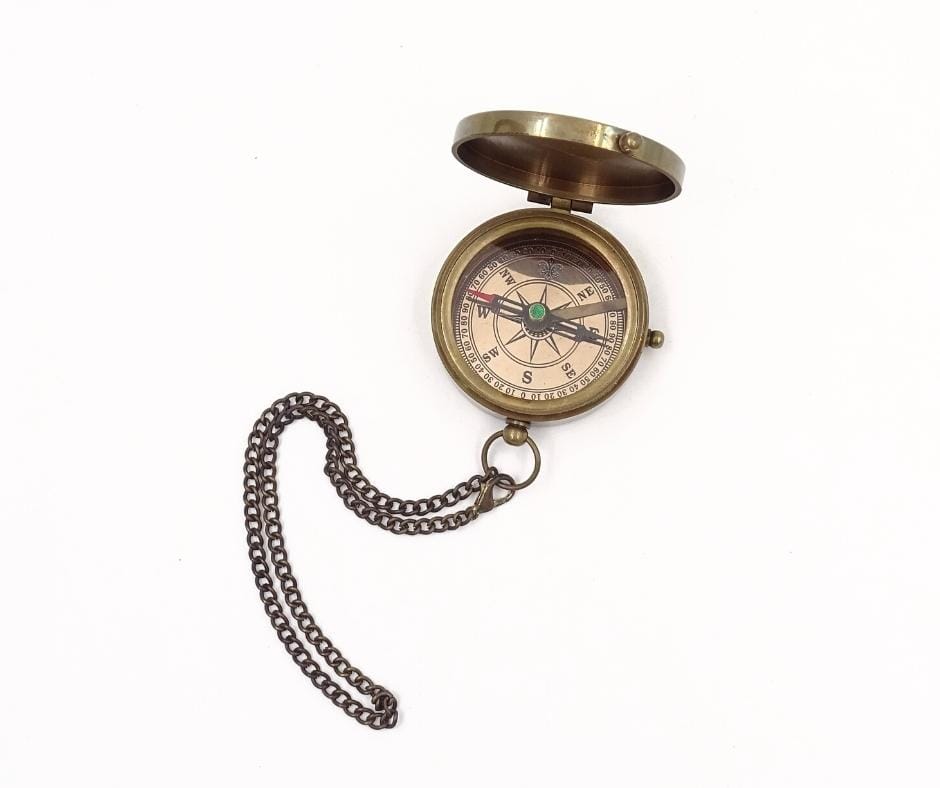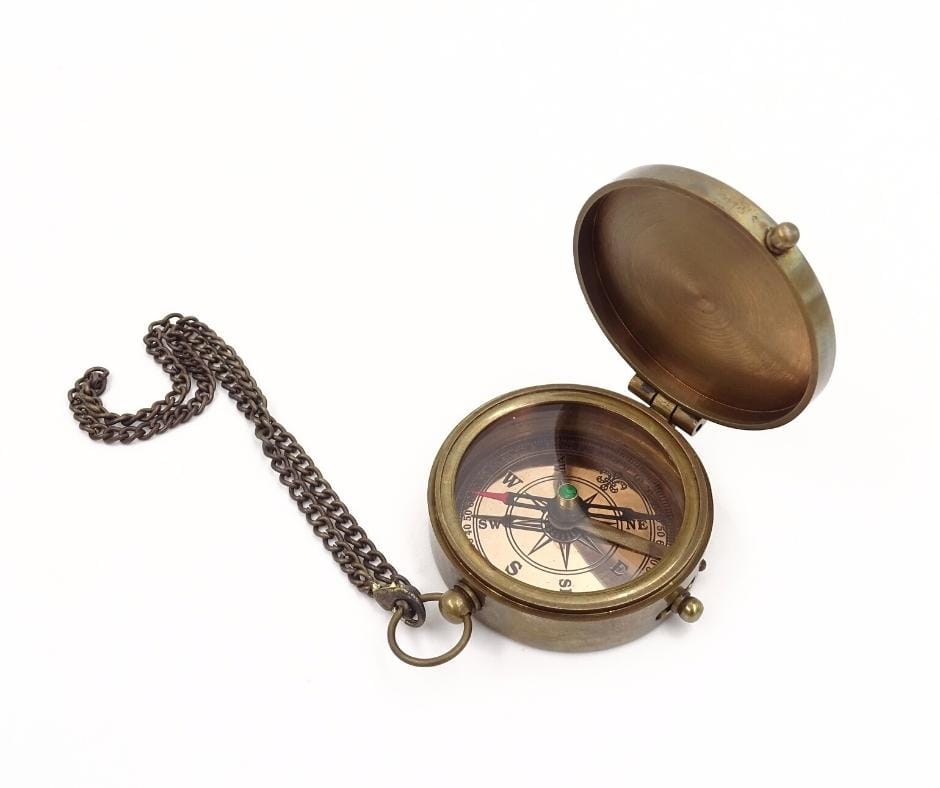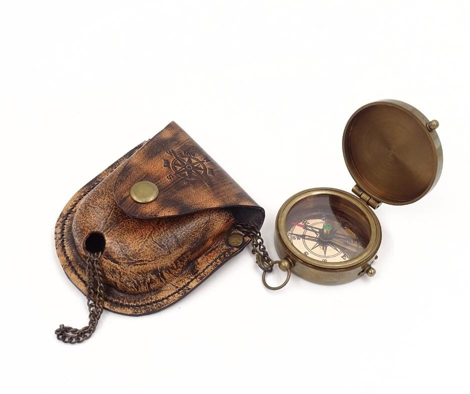 Zamykany kompas z łańcuszkiem w skórzanym etui C-64 Materiał: mosiądz Kolory obudowy: mosiężny Wymiary: średnica – 5 cm Czytelna róża wiatrów Łańcuszek do powieszenia kompasu Etui skórzane
