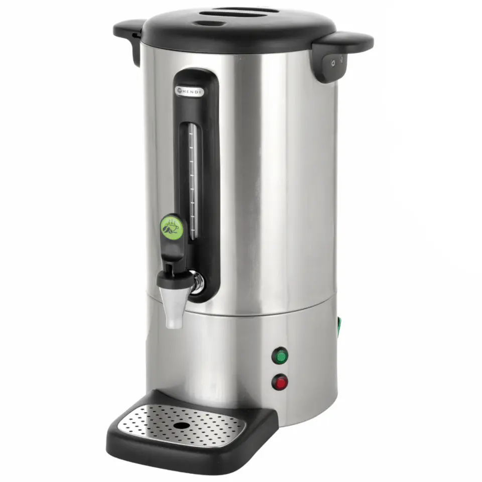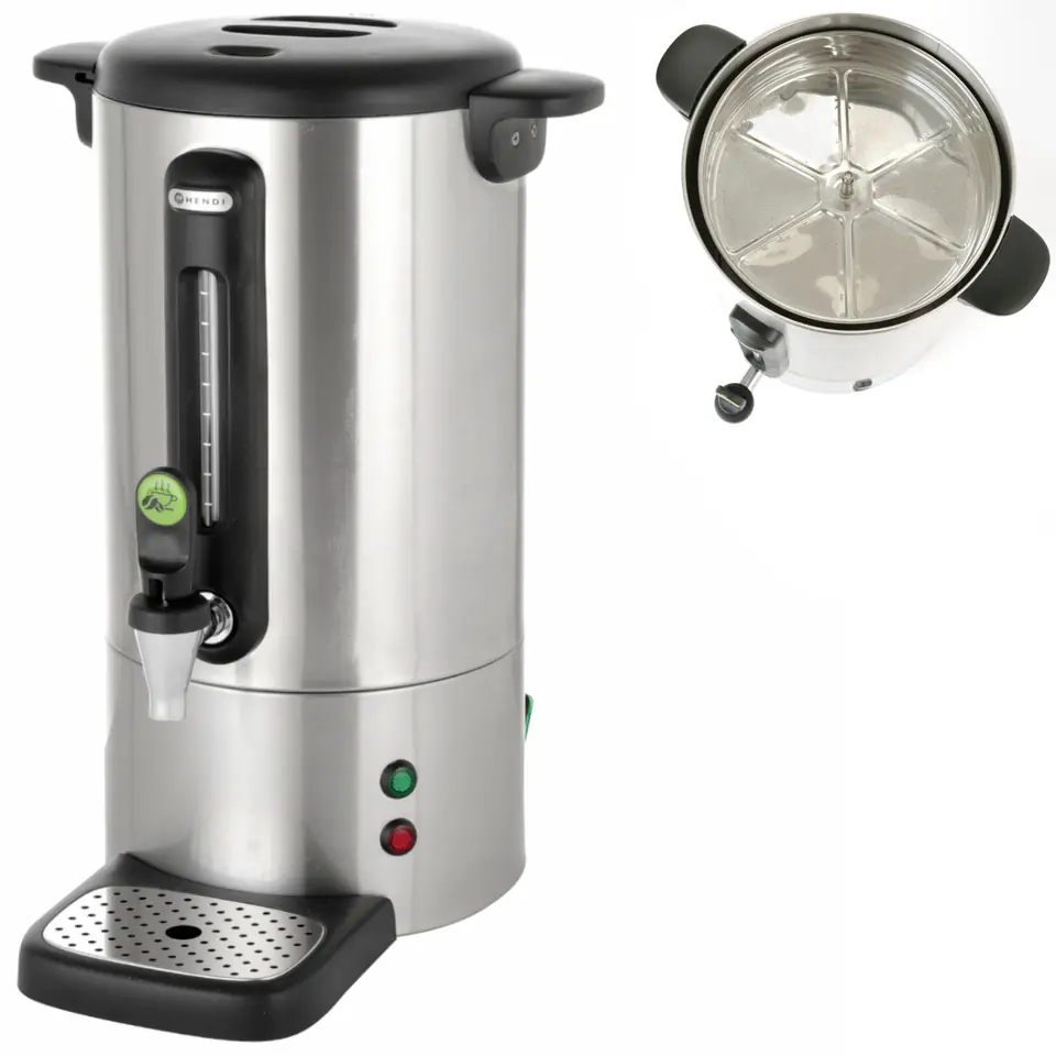 Kod producenta: 211434Zaparzacz do kawy UNIQ zaprojektowany został przez znanego holenderskiego projektanta Roberta Bronwassera. Unikalna konstrukcja i dbałość o szczegóły sprawia, że urządzenia przyciąga wzrok na każdym bufecie.Urządzenie posiada jednościenny korpus ze stali nierdzewnej ze stylowymi, polipropylenowymi uchwytami i pokrywą. Centralnie umieszczony kran zapobiega kapaniu, a szklany wskaźnik pokazuje poziom wody. Taca ociekowa mocowana za pomocą magnesu zapewnia łatwe opróżnianie. Lampka kontrolna sygnalizuje zakończenie procesu ogrzewania i ewentualną konieczność usunięcia kamienia. Naczynie filtracyjne ma wbudowany filtr do grubo zmielonej kawy, papier filtracyjny nie jest potrzebny. Perkolator utrzymuje kawę w temperaturze podawania po zaparzeniu.Cechy produktu: