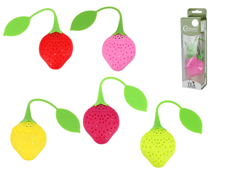 Zaparzacz do herbaty w kształcie truskawki. Świetnie się prezentują, stąd są dobrym pomysłem na prezent dla koneserów herbat liściastych.