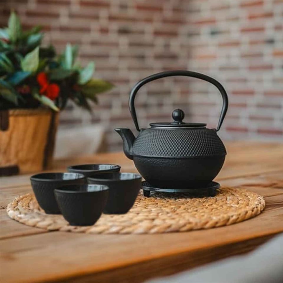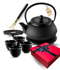 Żeliwo doskonale zatrzymuje ciepło, a emaliowana powłoka ułatwia utrzymanie czystości i poprawia estetykę. Czajnik wyposażony jest w ergonomiczny uchwyt oraz pokrywkę, a w zestawie znajdują się czarki, które umożliwiają komfortowe picie herbaty.