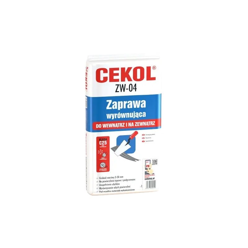 Cekol ZW-04 jest zaprawą służącą do uzupełniania ubytków i wyrównywania powierzchni ścian i podłóg. Cekol ZW-04 służy również, jako materiał do wykonywania podkładu podłogowego. Zastosowanie zaprawy CEKOL ZW-04 jako podkładu zmniejsza zużycie zapraw klejących i wylewek samoniwelujących przy pracach remontowych i wykończeniowych. Cekol ZW-04 można stosować przy systemach ogrzewania podłogowego.