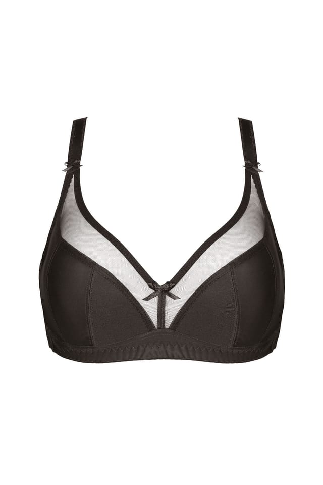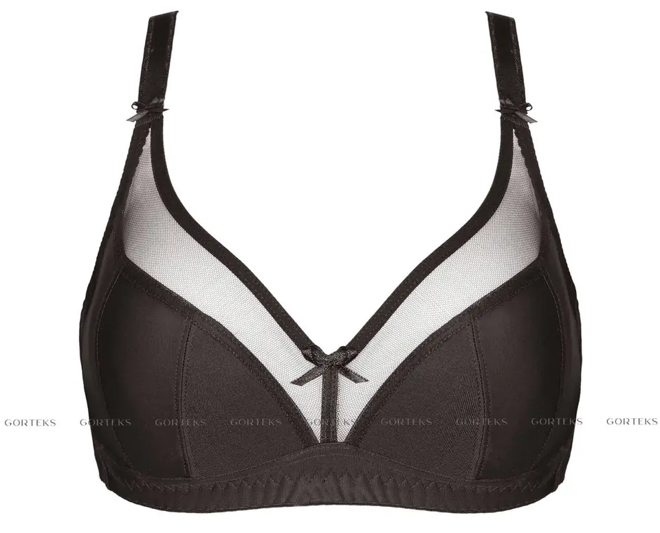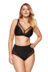 Klasyczny biustonosz miękki zaprojektowany z myślą o większych biustach, wykonany z dzianiny oraz tiulu.