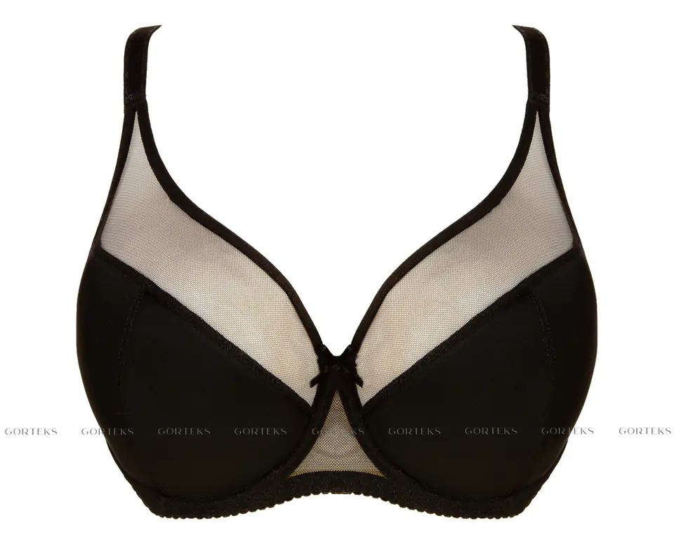 - Dolna część misek wykonana z cienkiej pianki gorseciarskiej, a górna z tiulu, dzięki czemu biustonosz doskonale dopasowuje się do kształtu piersi,