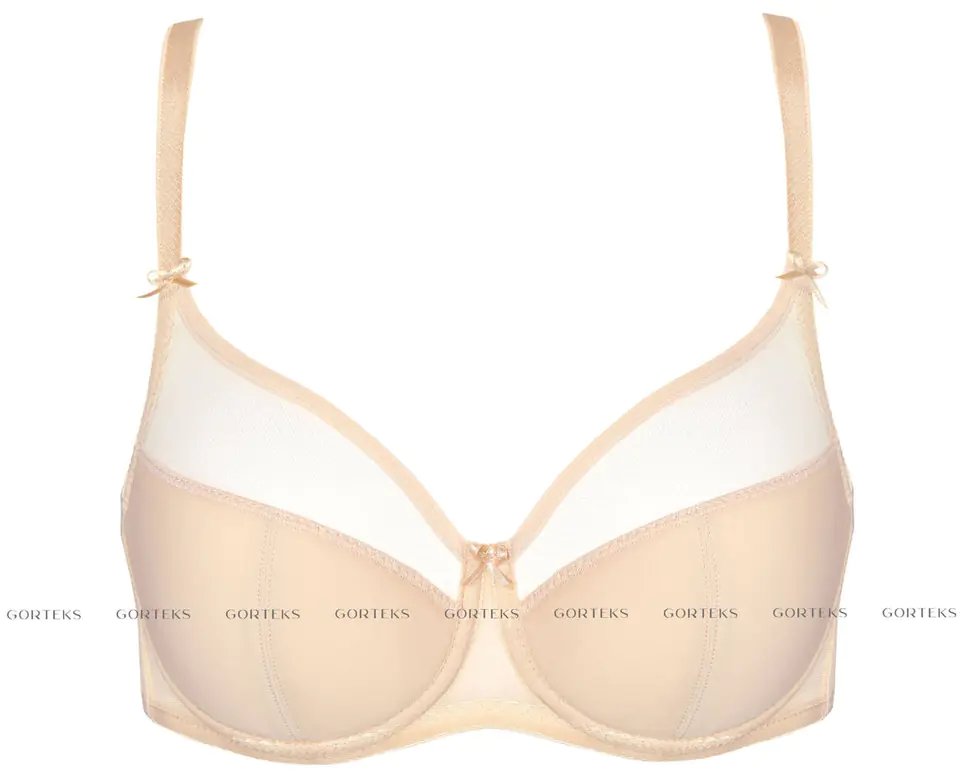 - Dolna część misek wykonana z cienkiej pianki gorseciarskiej, a górna z tiulu, dzięki czemu biustonosz doskonale dopasowuje się do kształtu piersi,