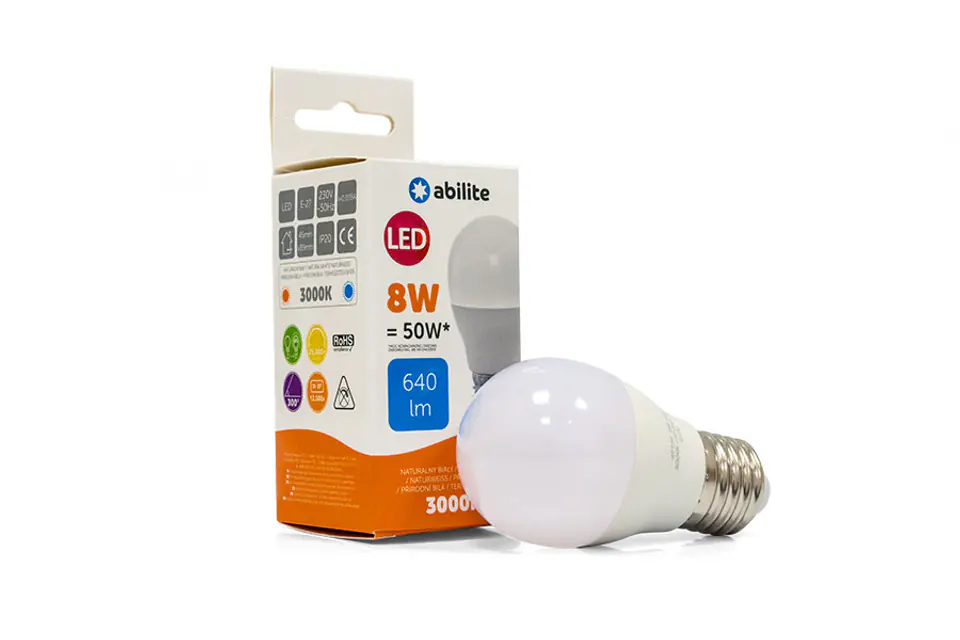 Ciepło biała, wyposażona w mleczny klosz w kształcie kulki żarówka o bardzo długim czasie świecenia i wysokiej jasności, przy jednoczesnym niskim zużyciu prądu. Mocowana w złączu E27. Dzięki wysokiej odporności na wszelkiego rodzaju wstrząsy i uderzenia cechuje się ona bardzo niską awaryjnością.Abilite LED, to nawet 80% oszczędność energii elektrycznejCzy wiesz, że wymieniając standardowe żarówki na oświetlenie LED możesz zaoszczędzić nawet 80% energii? Zakup oświetlenia LED zwróci się bardzo szybko, a Ty zmniejszysz swoje rachunki za prąd i będziesz oszczędzać pieniądze i środowisko. Abilite LED, białe światło jak w Twojej starej żarówceWybierając oświetlenie Abilite LED możesz zadecydować, czy oczekujesz by emitowało ciepłe, przytulne światło jak zwykłe żarówki (białe ciepłe), czy też zależy Ci na chłodnej bieli, która zmotywuje większego działania (białe zimne). Abilite LED, to znajomy kształtŻarówki Abilite LED dostępne są w szerokiej gamie rozmiarów i kształtów, które są Ci doskonale znane ze zwykłych żarówek. Bez problemu znajdziesz kształt odpowiadający Twoim potrzebom. Abilite LED, to wierne i naturalne koloryProdukty oświetleniowe LED marki Abilite posiadają wysoki współczynnik oddania barw (CRI), dzięki czemu bardzo wiernie i naturalnie oddają kolory oświetlanych przedmiotów. Abilite LED świecą zaraz po włączeniuNie czekaj aż Twoje oświetlenie osiągnie maksymalną jasność, nasze źródła światła LED świecą pełną jasnością zaraz po włączeniu.