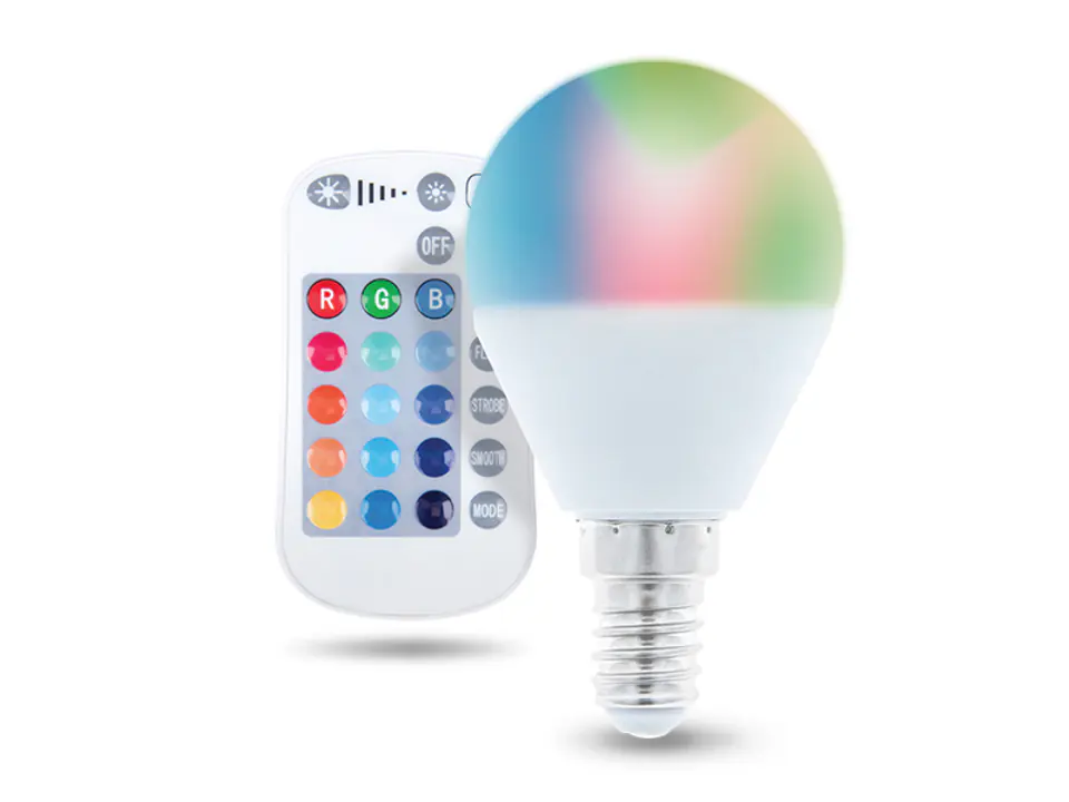 Wysokiej jakości żarówka RGB z trzonkiem E14, wyprodukowana w nowoczesnej technologii LED.