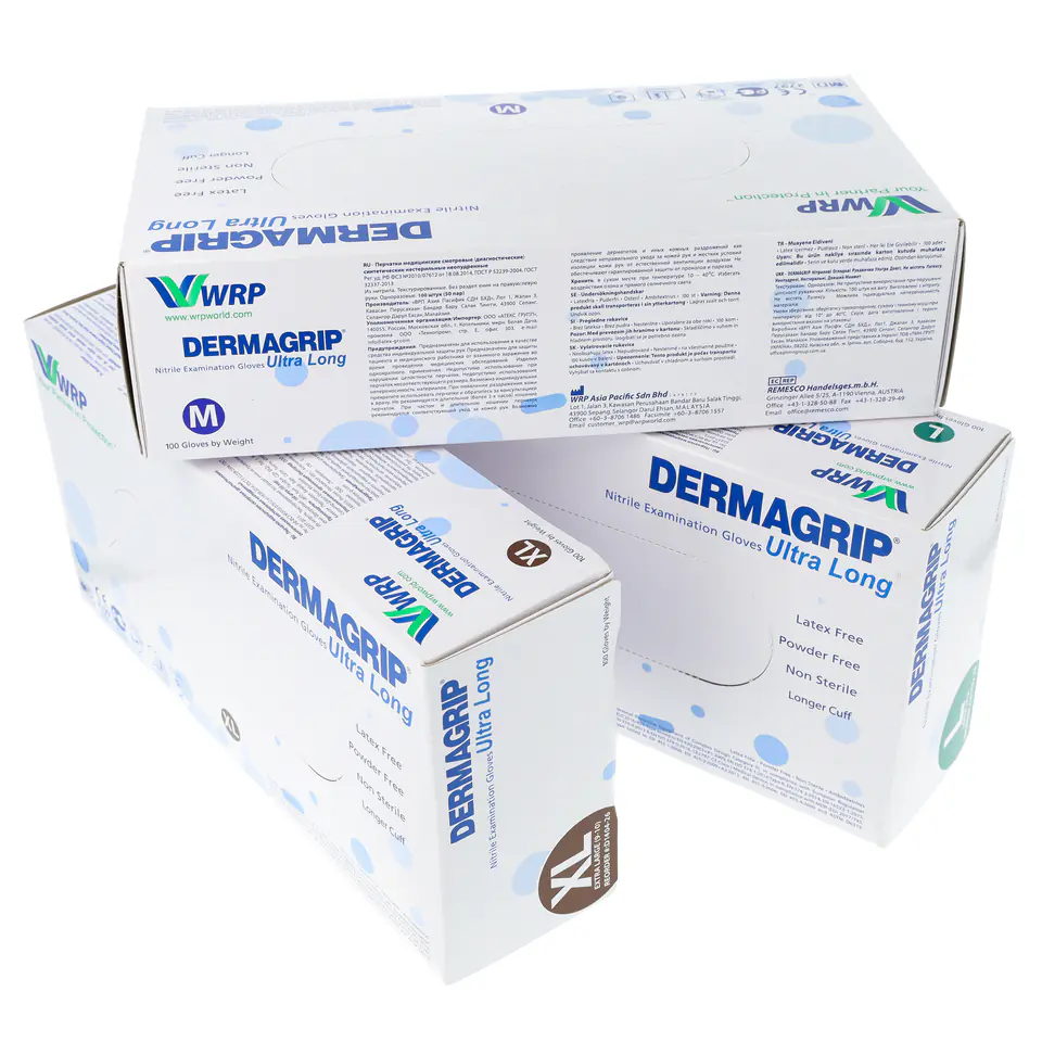 DERMAGRIP ULTRA LONG - rękawice diagnostyczne nitrylowe bezpudrowe, z przedłużonym mankietem Właściwości rękawic: Wyrób medyczny – klasa I oraz środek ochrony indywidualnej - kategoria III Przedłużony, rolowany mankiet chroniący dłonie oraz przedramię użytkownika dla lepszego komfortu pracy Bezpudrowe pozwalające wyeliminować podrażnienia skóry wywoływane przez puder Chlorowane od strony wewnętrznej Test przepuszczalności wody - AQL 1.5 Teksturowane palce Rolowany mankiet ułatwiający zakładanie Uniwersalny kształt pasujący na prawą i lewą dłoń Kolor niebieski Dopuszczone do kontaktu z żywnością Dostępne rozmiary: S, M, L, XL rozmiary rozróżnione kolorystycznie na opakowaniach Opakowanie jednostkowe 100 sztuk Produkt niesterylny