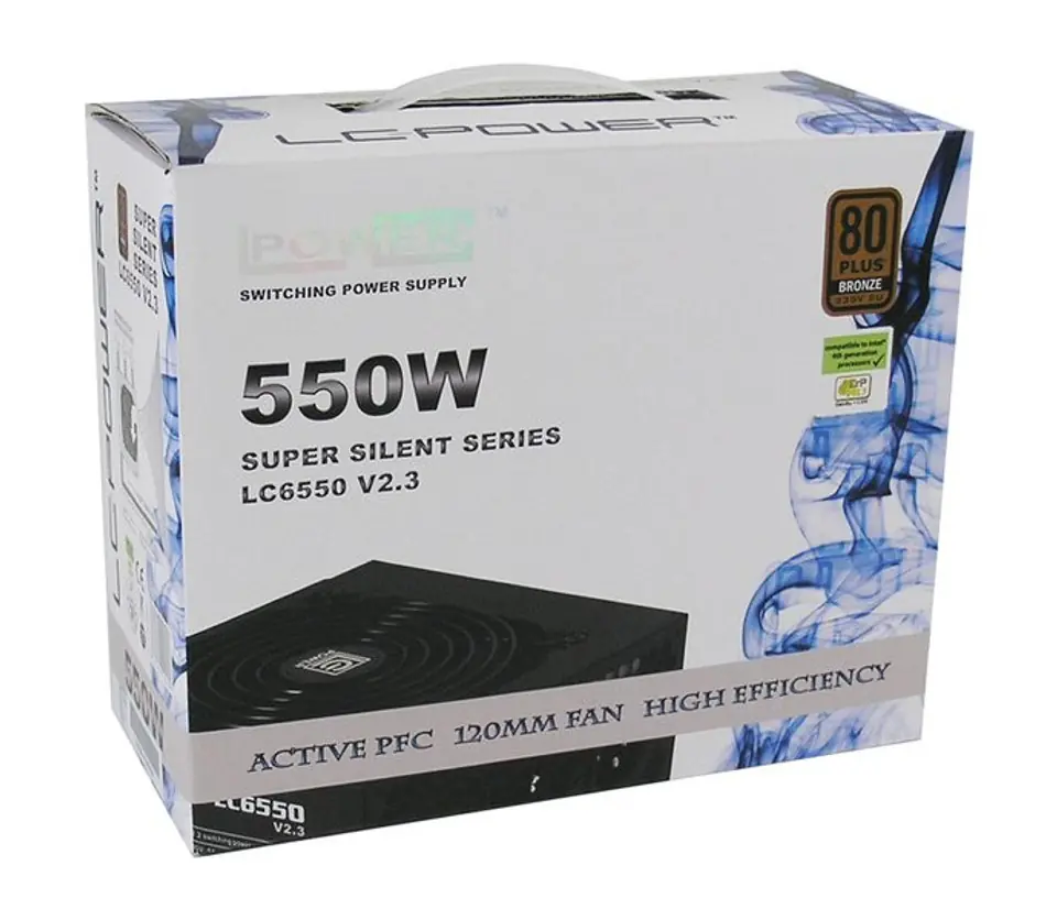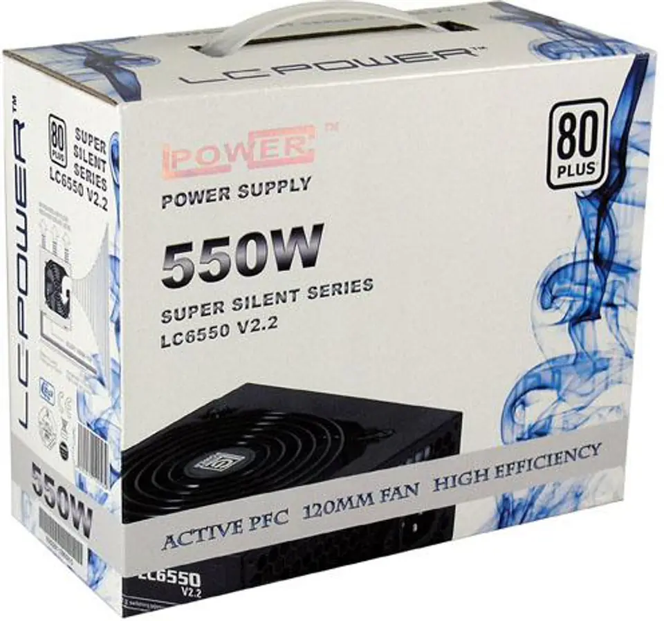 LC6550 V2.2 to zasilacz marki LC-Power o mocy 550W, przeznaczony do obudów komputerowych. Zasilacz jest kompatybilny z najnowszymi technologiami PC. Obsługuje najnowsze specyfikacje ATX12V, dzięki czemu może być używany z obecną i następną generacją platform z wielordzeniowymi procesorami. Wyposażony jest w aktywny układ PFC i charakteryzuje się niezwykle wysoką efektywnością do 84,87% skuteczności, zgodne z certyfikatem 80-PLUS. Olbrzymi, 120mm wentylator zapewnia właściwe chłodzenie dla jednostki, jest jednocześnie cichy i trwały.