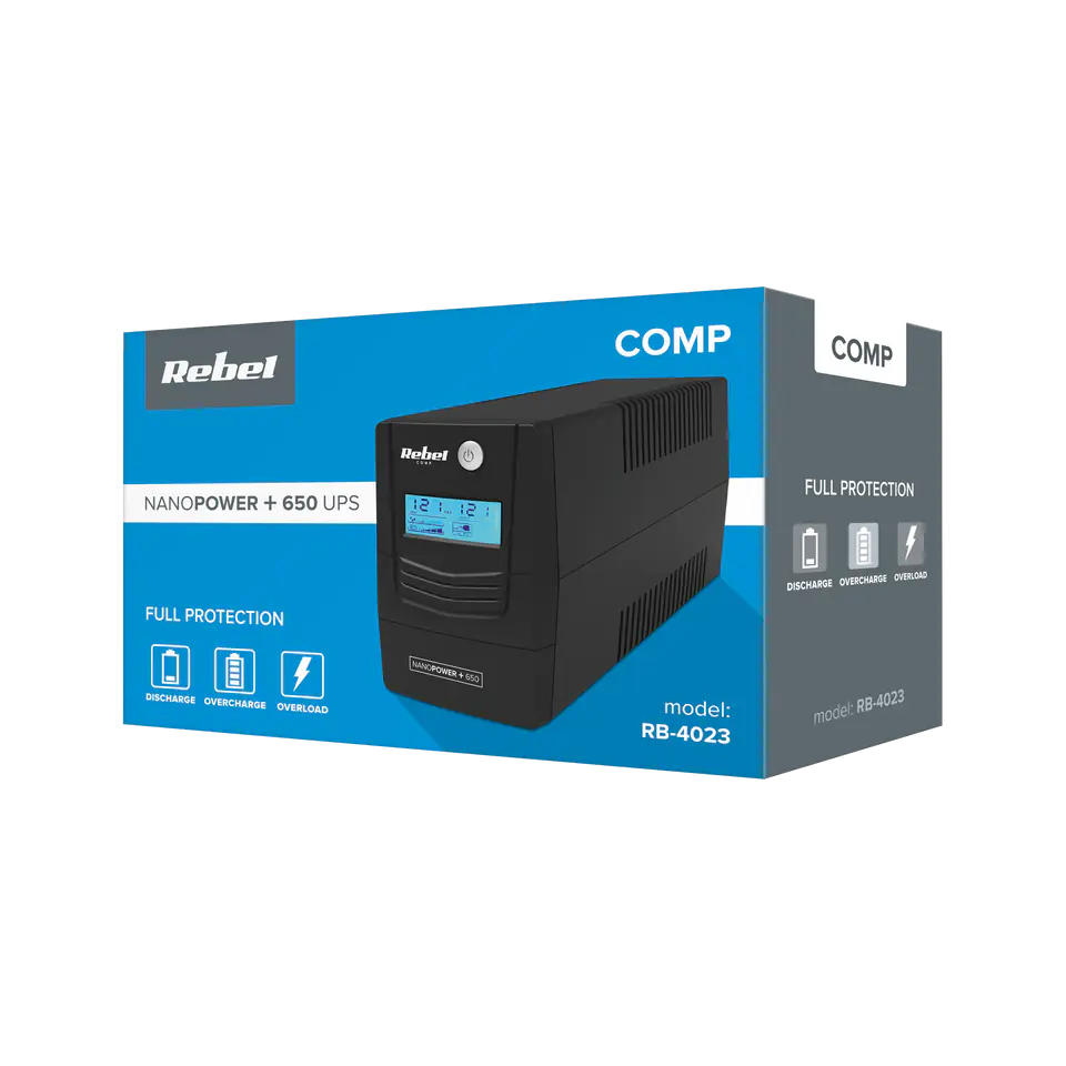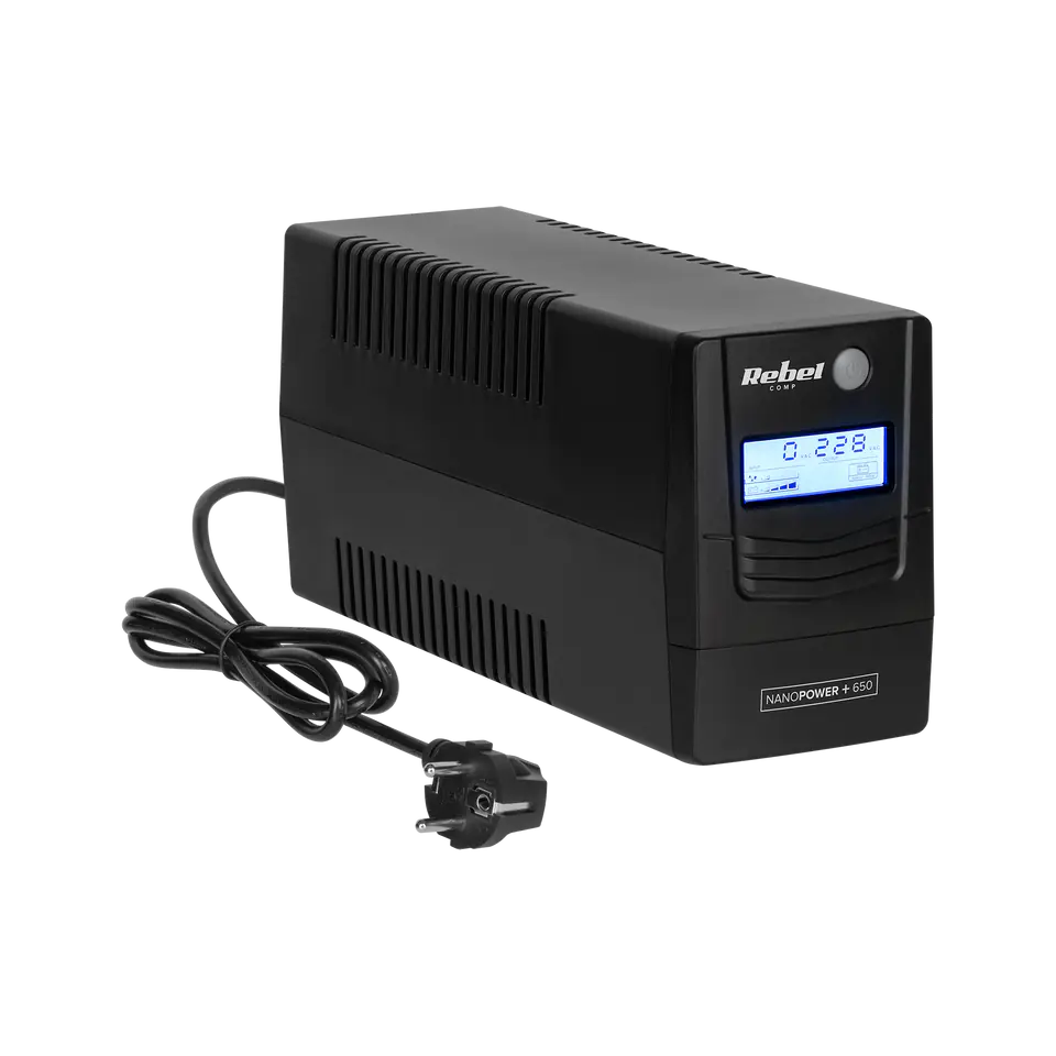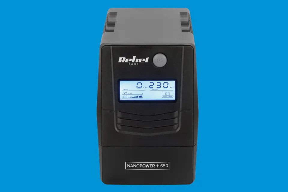 Zasilacz awaryjny komputerowy UPS REBEL model Nanopower Plus 650 offline, 650VA / 360W, 230 V, 50Hz, LCD, USB, RJ45