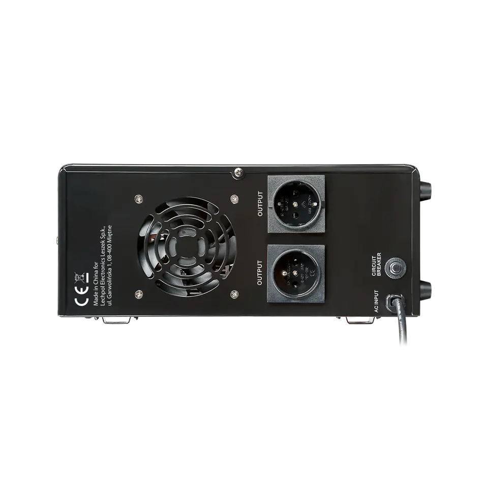 Moc znamionowa: 700 WRodzaj baterii: 12 V DCMaksymalne napięcie akumulatora: 15 V DCZakres napięcia wejściowego: 180 ~ 275 V ACCzęstotliwość wejściowa: 45 ~ 60 HzZakres napięcia wyjściowego: 230 V AC +/-8%Częstotliwość wyjściowa: 50/60 Hz +/-0,5 HzKształt napięcia wyjściowego: Czysta sinusoidaEfektywność wyjściowa >=85% ( DC na AC )Prąd ładowania akumulatora: Maks. 10 ACzas przełączania: Zabezpieczenia: Przed przeciążeniem , zwarciem, zbyt wysokim lub zbyt niskim napięciemDopuszczalna temperatura pracy: 0-40°CDopuszczalna wilgotność powietrza 10 - 90%Wymiary: 33,5x32x18 cmWaga: 7,55 kg