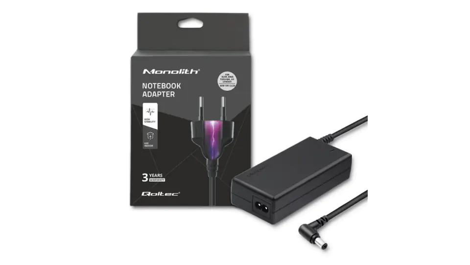 Nowoczesny, o wysokiej sprawności, dedykowany zasilacz sieciowy Qoltec do laptopów. Idealnie sprawdzi się w domu oraz w pracy, jako zasilacz główny lub zapasowy. Wyposażony w zaawansowane technologie (zabezpieczenia) przeciwprzepięciowe, przeciwprzeciążeniowe przeciwzwarciowe i termiczne, jest bezpieczny w użytkowaniu. Cechuje się niskim zużyciem energii i wysoką wydajnością. W zestawie kabel zasilający oraz rzep którym można regulować długość kabla zasilacza Qoltec.