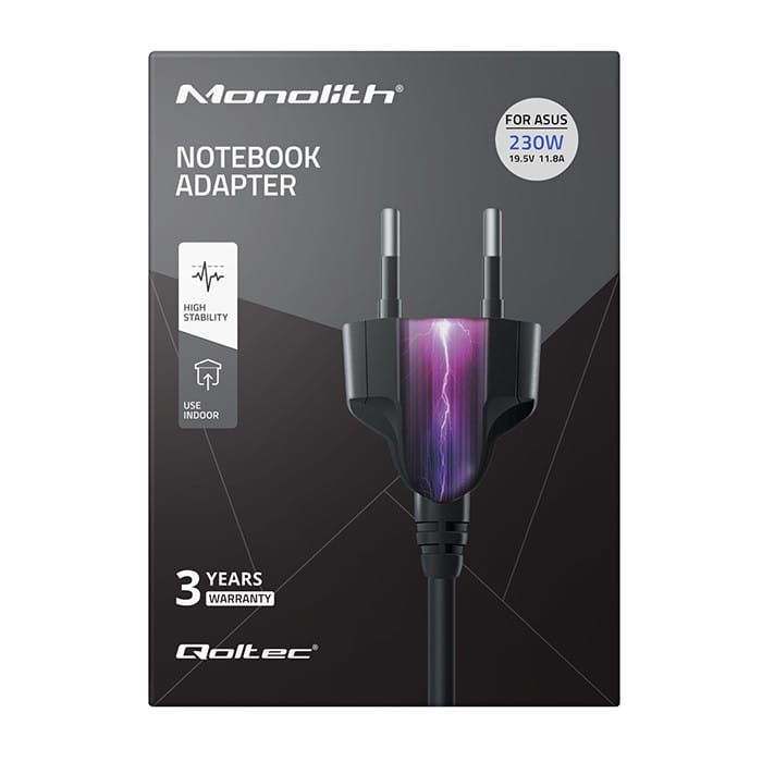 Zasilacz sieciowy o mocy 230W, kompatybilny z poszczególnymi modelami laptopów firmy Asus o wtyczce 5.5*2.5 mm.