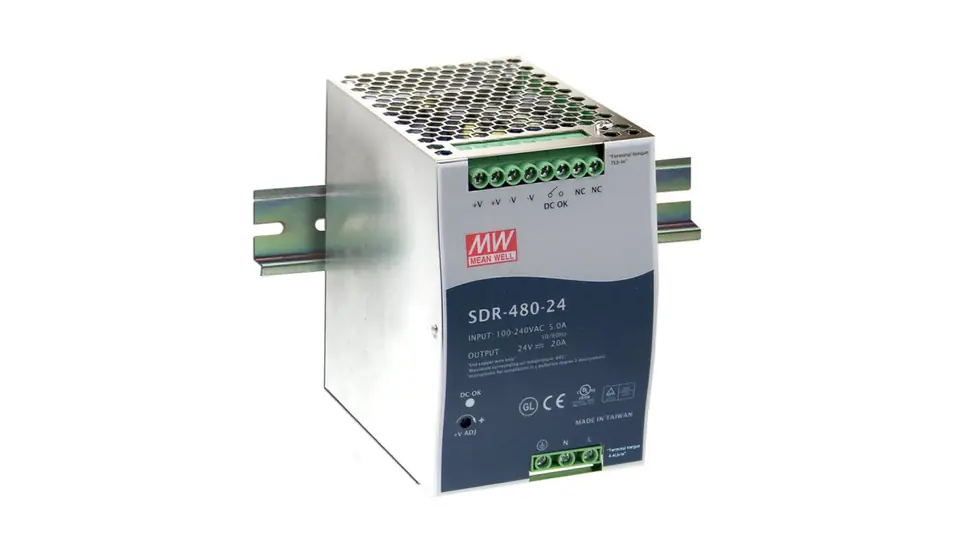 Zasilacz impulsowy instalowany na szynie TS35/7.5 lub 15 DIN, odporny na wysokie temperatury pracy (do 70°C)