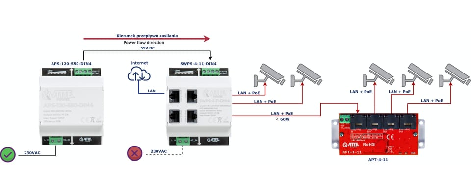 APS-120-550-DIN4 jest zasilaczem impulsowym w obudowie DIN4 umożliwiającej montaż na szynę TH35.Urządzenie zapewnia napięcie 55V na wyjściu.Najczęściej jest wykorzystywane do zasilania urządzeń IP PoE przykładowo switchy PoE w systemach automatyki i monitoringu.