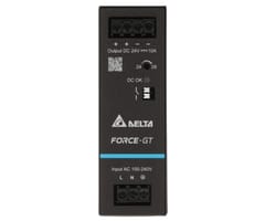 Zasilacz Delta Force-GT DRF-24V240W1GBA to przemysłowy zasilacz DIN 24V/10A (240 W) z uniwersalnym wejściem 90-264V AC i wysoką sprawnością, który stabilnie zasila urządzenia automatyki oraz elektronikę w szafach sterowniczych. Zwiększona odporność EMC i ochrona przepięciowa (z SPD do 6 kV) w połączeniu z konforemną powłoką PCB zapewniają niezawodność w trudnych warunkach, a wbudowany tryb stałoprądowy ułatwia zastosowania ładujące. Ultrasmukła konstrukcja na szynę DIN z chłodzeniem konwekcyjnym, regulacją napięcia 24-28 V oraz sygnalizacją DC OK (przekaźnik + LED) przyspiesza montaż, diagnostykę i serwis.