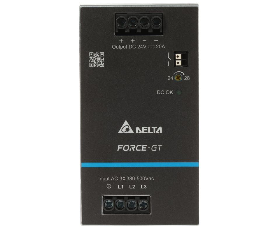 Zasilacz Delta Force-GT DRF-24V480W3GBA to przemysłowy zasilacz DIN 24V/20A (480 W) z uniwersalnym wejściem 3-fazowym 320-575 V AC oraz obsługą 2-faz 340-575 V AC, który zapewnia wysoką sprawność i stabilne zasilanie urządzeń automatyki. Wyróżnia się zwiększoną odpornością na zakłócenia i przepięcia z SPD do 6 kV, konforemną powłoką na płycie PCB, trybem stałoprądowym do zastosowań ładujących oraz sygnalizacją DC OK przez przekaźnik i diodę LED, co ułatwia nadzór i integrację w wymagających środowiskach. Ultrasmukła konstrukcja na szynę DIN z chłodzeniem konwekcyjnym upraszcza montaż w szafach sterowniczych i systemach przemysłowych.
