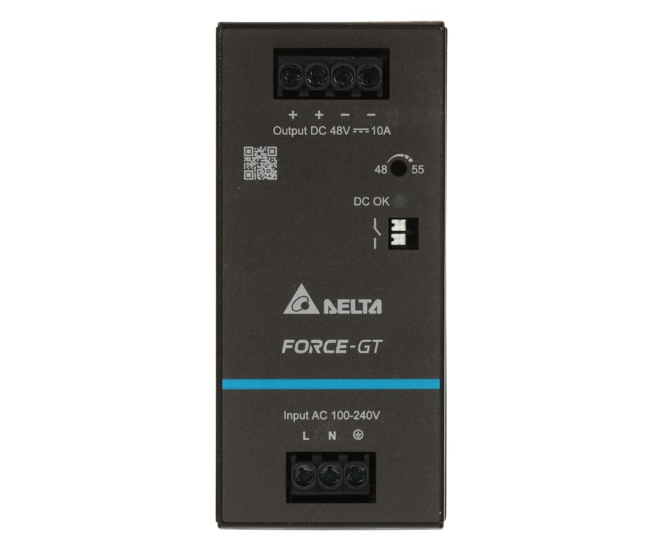 Zasilacz Delta Force-GT DRF-48V480W1GBA to przemysłowy zasilacz DIN 48V/10A (480 W) z uniwersalnym wejściem 90-264V AC i wysoką sprawnością, który stabilnie zasila urządzenia automatyki oraz elektronikę w szafach sterowniczych. Zwiększona odporność EMC i ochrona przepięciowa (z SPD do 6 kV) w połączeniu z konforemną powłoką PCB zapewniają niezawodność w trudnych warunkach, a wbudowany tryb stałoprądowy ułatwia zastosowania ładujące. Ultrasmukła konstrukcja na szynę DIN z chłodzeniem konwekcyjnym, regulacją napięcia 48-55 V oraz sygnalizacją DC OK (przekaźnik + LED) przyspiesza montaż, diagnostykę i serwis.