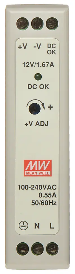 Zasilacz impulsowy instalowany na szynie TS35/7.5 lub 15 DIN, odporny na wysokie temperatury pracy (do 70°C)