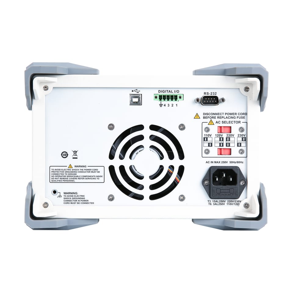 -----------PARAMETRY GŁÓWNE-----------Kanał 1/kanał 2Napięcie wyjściowe: 0 ~ 30 V Natężenie prądu wyjściowego: 0 ~ 5 A Moc wyjściowa: 315 WStabilizacja:• Napięcie wyjściowe: • Natężenie prądu wyjściowego: Liniowość regulacji:• Napięcie wyjściowe: • Natężenie prądu wyjściowego: Rozdzielczość:• Napięcie wyjściowe: 10 mV• Natężenie prądu wyjściowego: 1 mADokładność pomiaru (25oC ±5oC):• Napięcie wyjściowe: ±(0,1% odczytu+30 mV)• Natężenie prądu wyjściowego: ±(0,3% odczytu+5 mA)Stabilizacja napięcia przy połączeniu równoległym wyjść: ?0,01%+3 mVStabilizacja napięcia przy połączeniu szeregowym wyjść: Tętnienia (20 Hz ~ 20 MHz):• Napięcie wyjściowe: =< 1 mV rms• Natężenie prądu wyjściowego: =< 3 mA rmsOpóźnienie narastania napięcia: =Współczynnik temperaturowy napięcia wyjściowego: Współczynnik temperaturowy natężenia prądu wyjściowego: Kanał 3 (pomocniczy)Napięcie wyjściowe: 1,8 V/2,5 V/3,3 V/5,0 V ±50 mVStabilizacja napięcia wyjściowego: ±50 mVNatężenie prądu wyjściowego: 3 A-----------CECHY OGÓLNE-----------Port USB (5 V / 2 A)Zasilanie: AC 100 V/120 V/220 V/230 V ±10%, 50 Hz/60 HzZaawansowany wyświetlacz EBTN LCDWymiary: 240 x 168 x 347 mmWaga: 10,2 kgAkcesoria: Przewód sieciowy, przewody pomiarowe