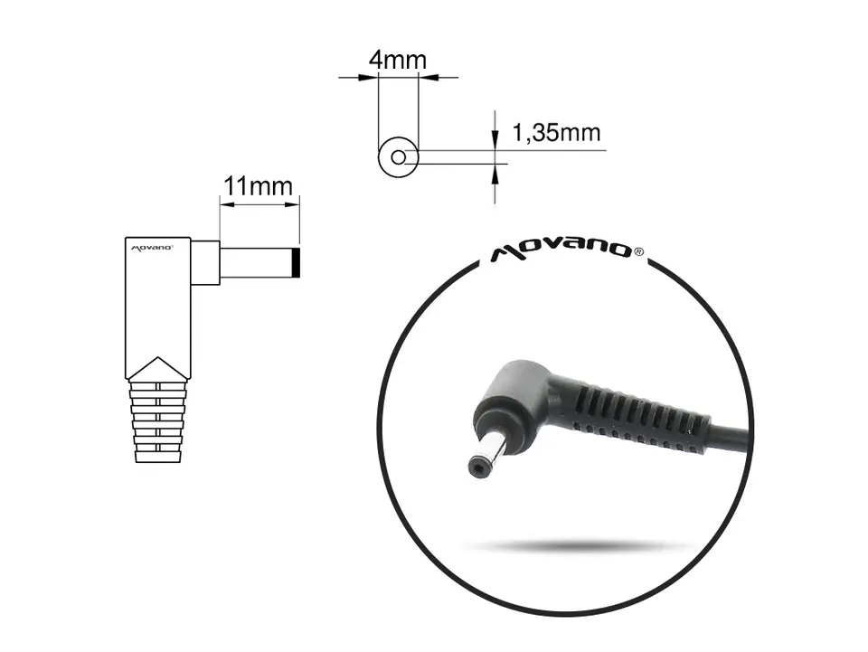 Jak dobrać odpowiedni zasilacz? : Parametry zasilania DC (direct current – prąd stały) podane są zazwyczaj pod laptopem na naklejce za napisem INPUT - napięcie V (wolty) zasilacza powinno się zgadzać z wartością podaną na laptopie - natężenie prądu A (ampery) powinno być równe lub większe od wartości podanej na laptopie, ten parametr oznacza maksymalny prąd jakim wolno obciążyć zasilacz, o wielkości obciążenia decyduje laptop - moc W (waty) to wynik przemnożenia napięcia i prądu - kształt i wielkość wtyku – prosimy porównać ze zdjęciem oferowanego przedmiotu oraz z wymiarami wtyku podanymi w opisie; możemy również ustalić na podstawie bazy danych producenta zasilaczy