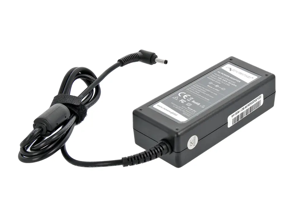 Jak dobrać odpowiedni zasilacz? : Parametry zasilania DC (direct current – prąd stały) podane są zazwyczaj pod laptopem na naklejce za napisem INPUT - napięcie V (wolty) zasilacza powinno się zgadzać z wartością podaną na laptopie - natężenie prądu A (ampery) powinno być równe lub większe od wartości podanej na laptopie, ten parametr oznacza maksymalny prąd jakim wolno obciążyć zasilacz, o wielkości obciążenia decyduje laptop - moc W (waty) to wynik przemnożenia napięcia i prądu - kształt i wielkość wtyku – prosimy porównać ze zdjęciem oferowanego przedmiotu oraz z wymiarami wtyku podanymi w opisie; możemy również ustalić na podstawie bazy danych producenta zasilaczy