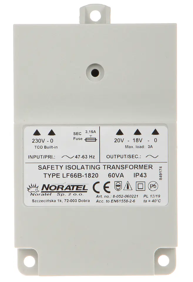 Jednofazowy transformator bezpieczeństwa z wbudowanym zabezpieczeniem przeciwzwarciowym i termicznym, zaprojektowany został i wykonany według normy EN61558-2-6Uzwojenia są separowane i zalane masą poliuteranową w samogasnącej obudowie