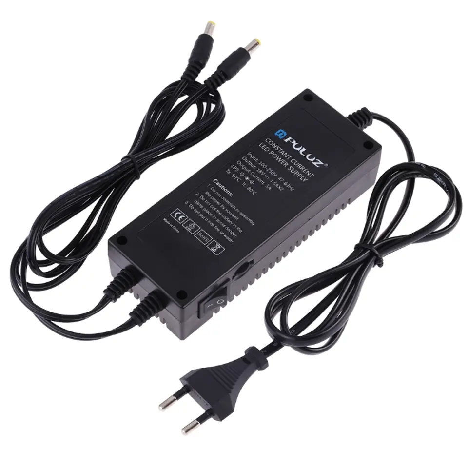 Zasilacz do namiotu studyjnego marki Puluz. Wykonany z wysokiej jakości materiałów, bezpieczny podczas użytkowania. AC 100-250V - DC 18V 3A.