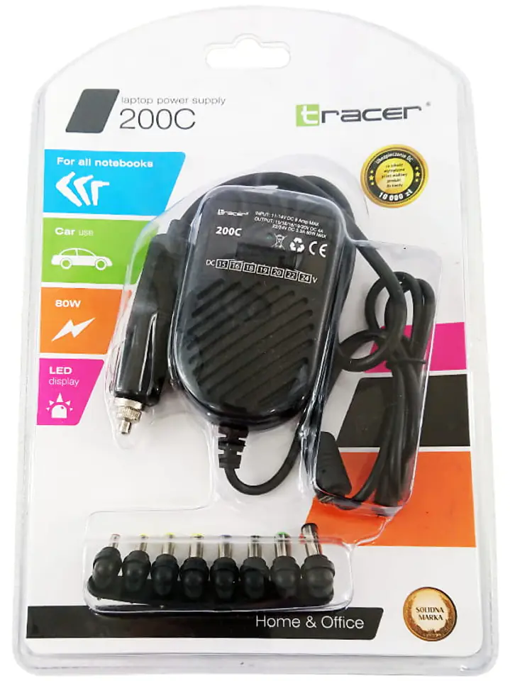 Zasilacz samochodowy Tracer 200C pasujący do laptopów laptopów różnych marek. Zasilany z gniazda zapalniczki samochodowej. W komplecie znajduje się zestaw końcówek pasujący do większości laptopów marek takich jak Dell, Acer, Asus, HP itd.