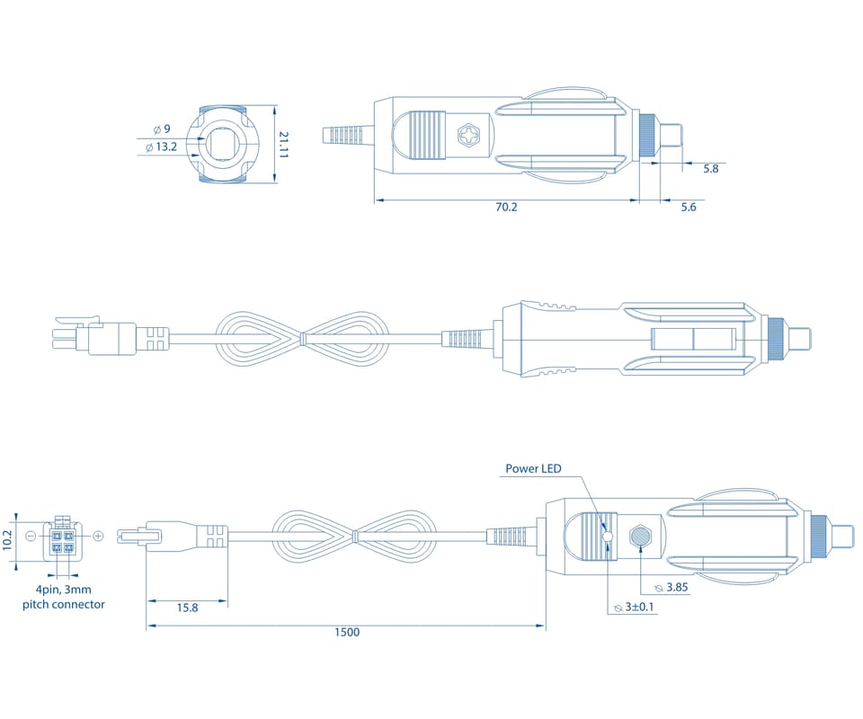 | Typ złącz zasilania: | Wtyk zapalniczki samochodowej 4 pin / 3 mm |
