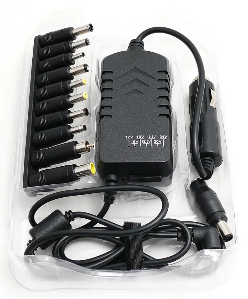 Uniwersalny zasilacz samochodowy do laptopa TIR 90W 24V jest zasilany napięciem z zakresu 12-24V. Napięcie wyjściowe wybierane jest za pomocą przełącznika na obudowie. Do zestawu dołączona jest zaślepka, która pozwala zablokować przełącznik na wybranej wartości napięcia wyjściowego. Najważniejsze cechy:1.Elektronika oparta na nowoczesnym i szybkim mikroprocesorze2.Ładowarka chroni baterię i laptopa przed przeładowaniem, zwarciem, przepięciem lub przegrzaniem3.Zasilacz po naładowaniu baterii laptopa rozłącza proces ładowania i przechodzi w tryb podtrzymaniaBudowa1.Filtr przeciwzakłóceniowy (ferrytowy) na przewodzie do laptopa2.Gniazdo USB na obudowie3.Szczelna obudowa z pasywnym chłodzeniem4.Zestaw wymiennych wtyków do laptopa Jakie urządzenia zasila TIR 90W 24V? W zestawie znajduje się 11 wymiennych końcówek, pasujących do większości laptopów na naszym rynku: Typ A: 6.5x4.4mm - Fujitsu, Sony, SamsungTyp B: 5.5x2.5mm - Liteon, NEC, ToshibaTyp D: 6.3x3.0mm - Nec, ToshibaTyp E: 4.8x1.7mm - Compaq, HP, Delta, Asus, NecTyp F: 5.5x.2.5mm- Acer, Compaq, Delta, Fujitsu, HP, IBM, LiteonTyp G: 5.5x3.0mm - SamsungFor Dell: 7.4x5.0mm - DellTyp L: IBM 20V 4.5ATyp P: 4.8x1.7mm - Compaq, AsusTyp X: HP 15V-24V, 3.75A-6ATyp Z: Lenovo 15V-24V, 3.75A-6A