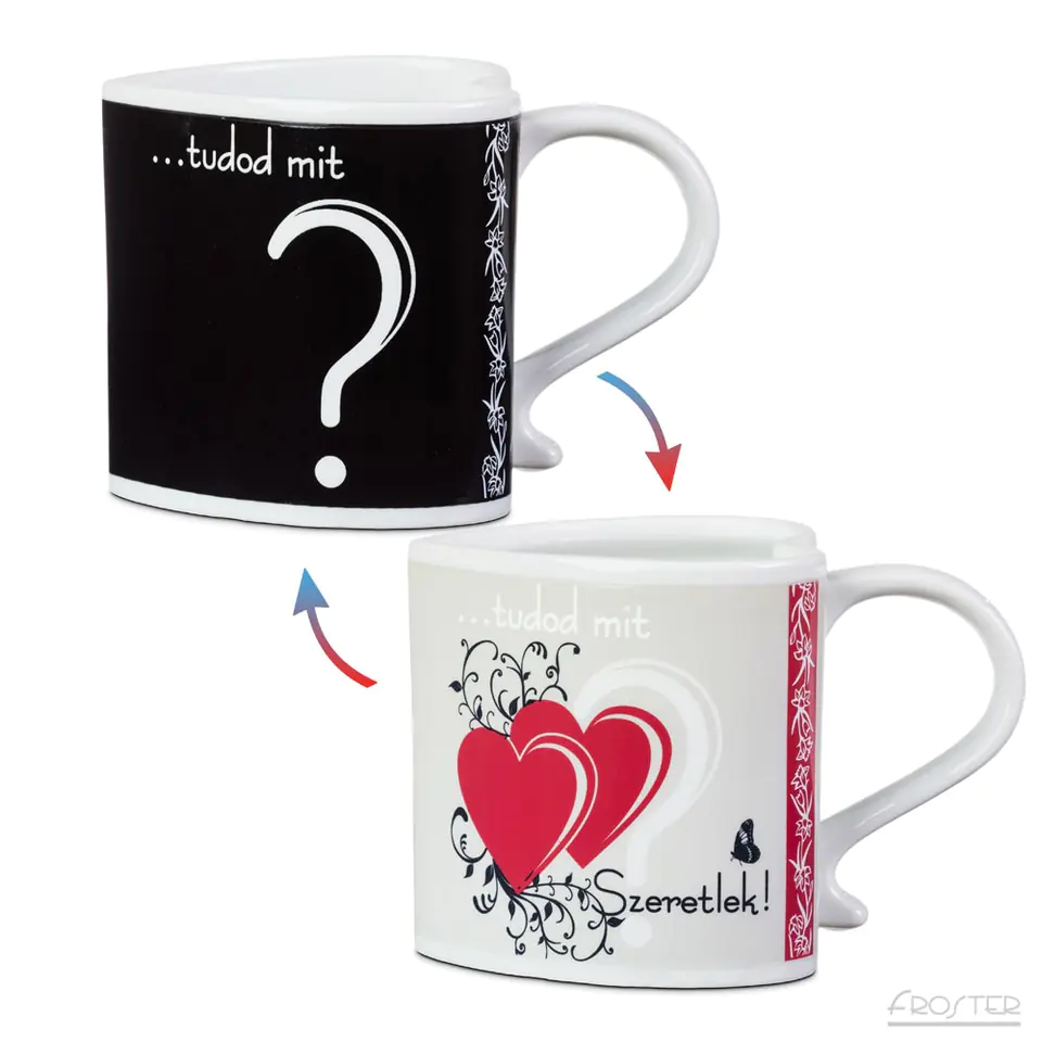 - Magiczny kubek: dzięki specjalnej farbie nadruk na kubku zmienia wygląd pod wpływem ciepła. Po wystygnięciu lub zalaniu zimną wodą wraca do stanu początkowego.W przeciwieństwie do innych termoczułych kubków, ten kubek zmienia wygląd na całej powierzchni. Nadruk wokół całego produktu. Napis na produkcie: Tudod mit? Szeretlek. Produkt w węgierskiej wersji językowej. Materiał: porcelana. Wymiary: 8,5 cm (wysokość), 300 ml (pojemność). Nadaje się do kontaktu z żywnością. Produkt jest chroniony zarejestrowanym znakiem towarowym.Produkt bezpieczny