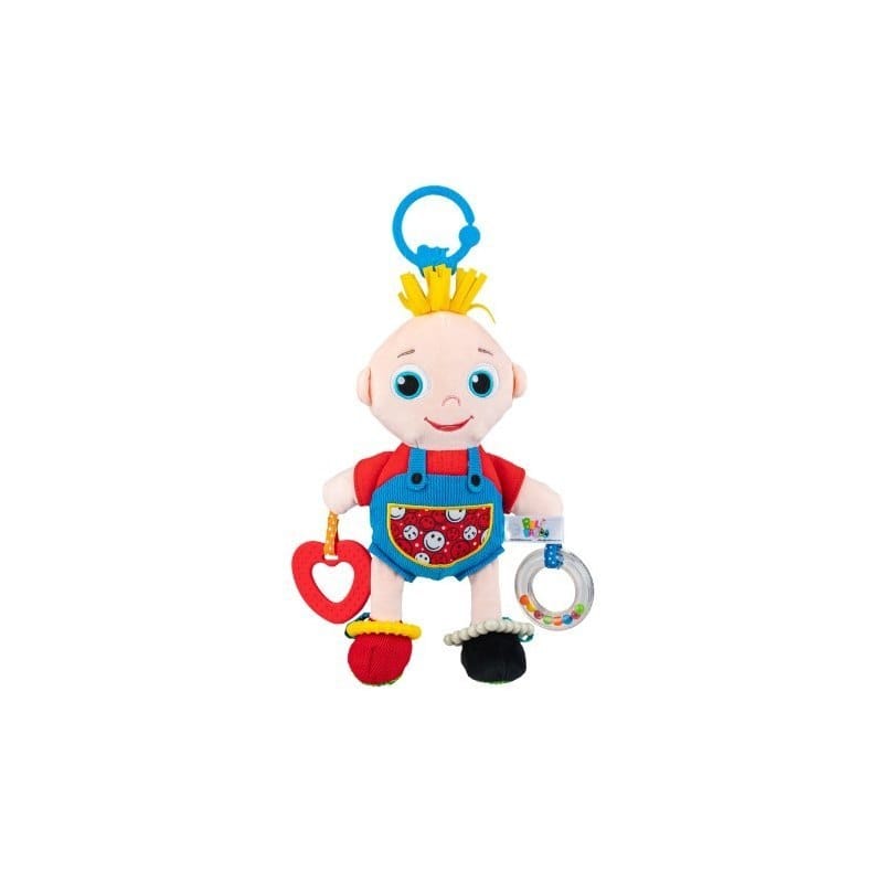 Zawieszka Bobas Bobas dla bobasa! Wesoła, materiałowa lalka w kształcie małego chłopczyka to zawieszka, która towarzyszyć może dziecku w dowolnym miejscu, zarówno na spacerze, jak i w domowym zaciszu. Zabawka kryje w sobie wiele niespodzianek. Zdobią ją gryzaki oraz grzechotka, a sam materiał, z którego została wykonana, odznacza się zróżnicowanymi fakturami, które stymulować będą zmysł dotyku dziecka. Praktyczna zawieszka pozwoli przyczepić lalkę w dowolnym miejscu. Cechy produktu: - zróżnicowane materiały; - gryzak; - grzechotka; - ruchome elementy przy nóżkach (plastikowe kształty); - praktyczna zawieszka do przymocowania w wybranym miejscu; Wiek: 0m+