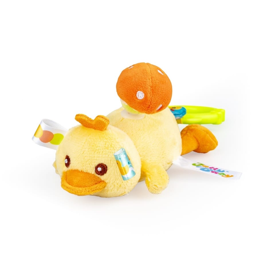 Zabawny kaczorek rozkręci super zabawę! W tym uroczym ptaszku kryje się dzwoneczek, który wydaje wesoły dźwięk przy potrząsaniu zabawką. Na grzbiecie kaczorka znajduje się pluszowy grzybek, który zakręci się wesoło, gdy tylko pociągniesz za kółeczko z pszczółką przy zawieszce lub za, przyczepionego wcześniej, Jasia. Kaczorek podciągnie się na tasiemce z powrotem do góry, wesoło przy tym wibrując. Zabawka wykonana została z materiałów o zróżnicowanych fakturach.