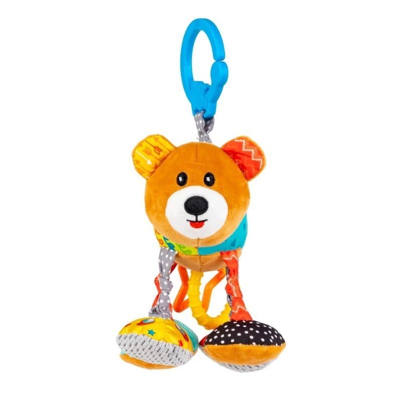 Zawieszka Kolorowy Miś Jacuś z wibracją Kompaktowa zabawka sprawdzi się świetnie zarówno w domowym zaciszu, jak i w podróży! Miś, którego futerko tworzą materiały o zróżnicowanych kolorach, wzorach oraz fakturach, to pomysł na wesołe wprowadzenie do świata bodźców wzrokowych i dotykowych. Do zabawki doczepione są zawieszki w kształcie gwiazdki i kółeczka. Misiek posiada także funkcję wibracji, a uruchamia się ją poprzez pociągnięcie zabawki w dół. Praktyczna zawieszka pozwoli przymocować zwierzaka do poręczy łóżeczka czy uchwytu wózka, aby mógł towarzyszyć bobasowi w każdej sytuacji. Cechy produktu: - wibracja; - doczepiony gryzaczek; - zróżnicowane faktury materiałów; - piszczałka; - grzechotka; - szeleszczący element; Wiek: 0m+