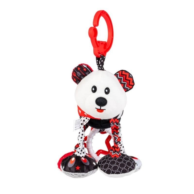 Zawieszka Kontrastowy Miś Jacuś z wibracją Mały towarzysz wycieczek zainspiruje bobasa do sensorycznej zabawy! Misiek w kontrastowych kolorach posiada doczepione zawieszki w kształcie gwiazdki i kółeczka. Zabawka została uszyta z materiałów różniących się kolorem, wzorem i fakturą, co pozwoli najmłodszym rozwijać zdolności poznawcze, stymulując przy tym zmysł wzroku i dotyku. Pluszak wyposażony został w funkcję wibracji. Wystarczy pociągnąć miśka w dół, a podciągnie się z powrotem na materiałowej harmonijce, zabawnie przy tym wibrując. Zabawka posiada praktyczną zawieszkę, która umożliwia jej zaczepienie w dowolnym miejscu. Cechy produktu: - wibracja; - doczepiony gryzaczek; - kontrastowe kolory; - zróżnicowane faktury materiału; - piszczałka; - grzechotka; - szeleszczący element; Wiek: 0m+