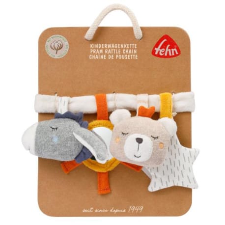 Zawieszka, Łańcuch Edukacyjny, z kolekcji: Natura 2Zabawka zapewnia dziecku radość w każdej podróży. Śpiący osiołek i Miś, w których ukryta jest grzechotka, pobudza zmysł dotyku dziecka i wzbudza naturalną ciekawość. Bezpieczne lusterko w kształcie Słońca, oraz Gwiazdeczka z szeleszczącym papierem, przyciągają uwagę dziecka. Dwie wygodne tasiemki umożliwiają proste i elastyczne przymocowanie łańcucha do wózka, fotelika dziecięcego, kojca i łóżeczka. Zawieszka pomaga dziecku odkrywać fascynujący świat podczas podróży lub spaceru.Wykonana jest z wielu, miłych w dotyku, materiałów.Rozwija logiczne myślenie, koncentrację, małą motorykę.Wzbudza ciekawość i stymuluje percepcję dziecka.Bezpieczne lusterko, grzechotki i szeleszczący papier, wyzwalają chęć zabawy.Do zawieszenia na łóżeczku, wózku, nosidełku itp. za pomocą tasiemek.Można prać ręcznie w 30deg;C. .Rozmiar: 35 cm x 10 cm x 3 cm.Wymiary opakowania: 25 cm x 20 cm x 4 cm.Wszystkie zabawki niemieckiej marki FEHN są bezpieczne dla dzieci od 0 lat.Wykonane są z najlepszej jakości materiałów.Spełniają normy EN71, CE, Są testowane pod kątem bezpieczeństwa przez niezależne instytuty badawcze.