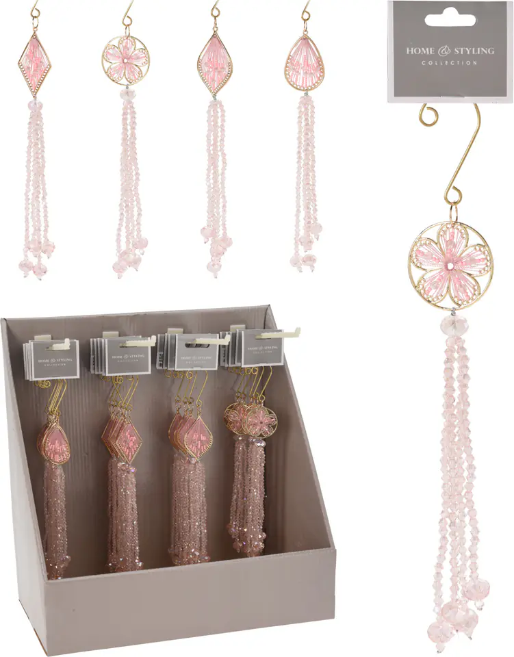 ZAWIESZKA Z KORALIKIAMI 23CM 4 RODZAJE Home & Styling CollectionOdkryj elegancką zawieszkę z koralikami idealną do dekoracji Twojego wnętrza. Dzięki delikatnym, różowym odcieniom oraz unikalnemu designowi, ten produkt wprowadza przytulną atmosferę i dodaje charakteru każdemu pomieszczeniu.Kluczowe cechyZawieszka o długości 23 cm stanowi efektowną dekorację, która przyciąga wzrok.Różowe koraliki w połączeniu ze złotymi detalami wprowadzają elegancki akcent do wnętrza.Wykonana z wysokiej jakości materiałów, co zapewnia trwałość i estetyczny wygląd.Unikalne kształty dekoracji (kwiat, łezka, diament) umożliwiają dopasowanie do różnych stylów aranżacji.Łatwy w montażu haczyk w komplecie, co ułatwia jego zawieszenie w wybranym miejscu.Dlaczego warto wybrać Home & Styling CollectionZawieszki z koralikami to nie tylko efektowna ozdoba, ale także sposób na personalizację przestrzeni. Ich delikatność oraz różnorodność wzorów sprawiają, że doskonale pasują zarówno do nowoczesnych, jak i klasycznych wnętrz. Ożyw swoje otoczenie dzięki niepowtarzalnym detalom, które będą zachwycać każdego dnia.Zastosowanie i pielęgnacjaZawieszkę można wykorzystać jako ozdobę w oknie, biurku lub wieszać w szafach. Należy unikać używania silnych środków czyszczących. Do czyszczenia zaleca się użycie wilgotnej ściereczki.Dane techniczneWymiary: długość 23 cm, szerokość 8,67 cmMateriał: metal, tworzywo sztuczneKolor: różowy, złotyKompatybilność: uniwersalna dekoracjaPojemność: brak