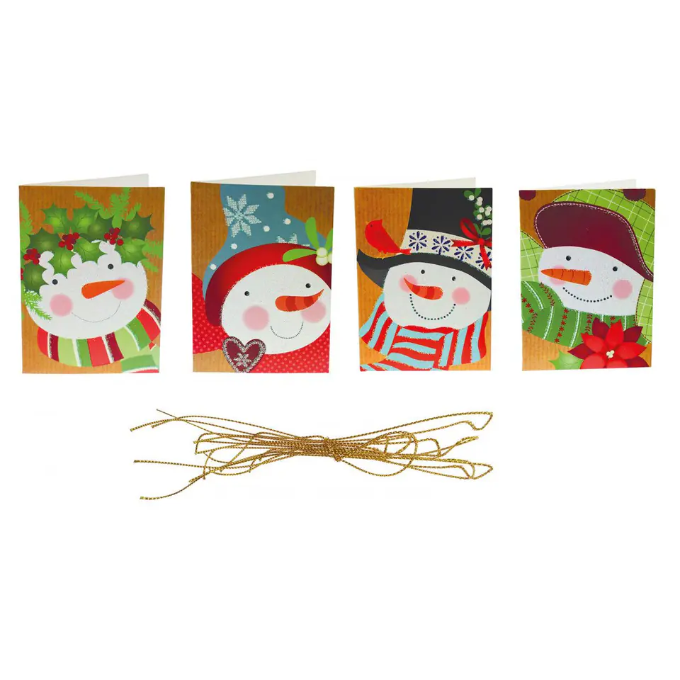 Karnety prezentowe, wzór: Boże Narodzenie, wymiary: 50 x 70 mm, 4 wzory: brokatowane głowy bałwanków. 8 sztuk + sznureczek 1,5 m.