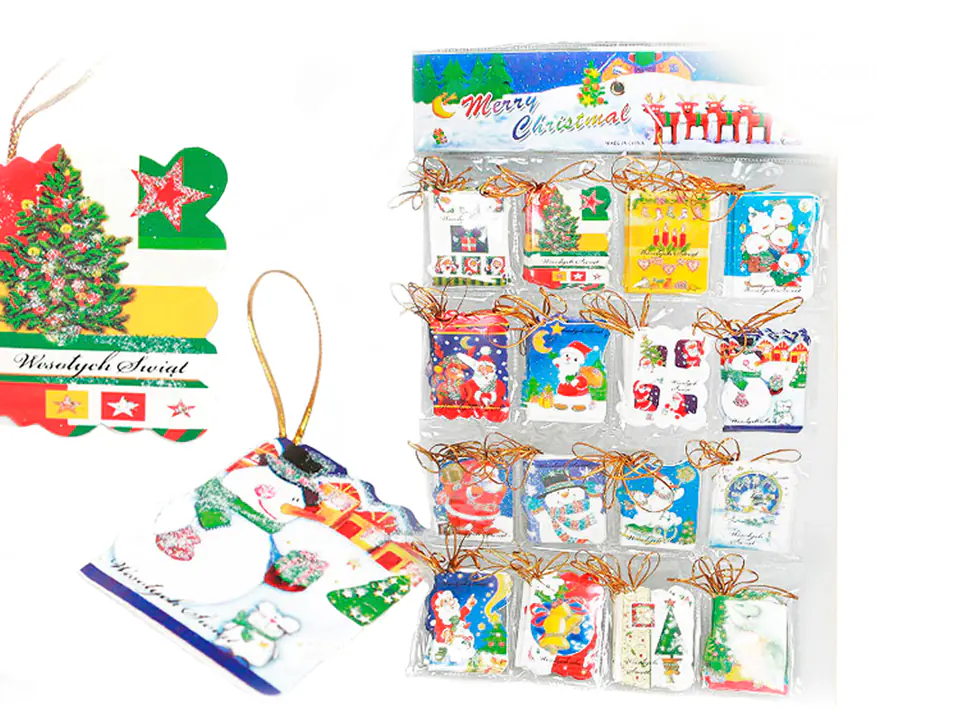 Zestaw świątecznych zawieszek na prezenty w 16 wzorach. Każda z innym rysunkiem i życzeniami Wesołych Świąt.