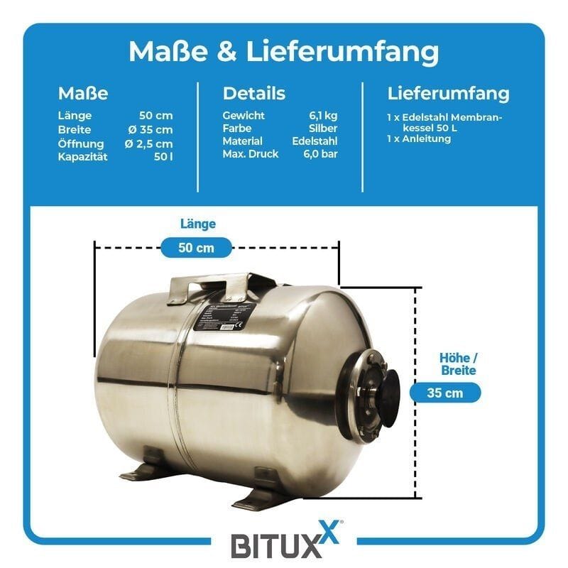 Zbiornik membranowy BITUXX 50L | Stal nierdzewna | Naczynie ciśnieniowe 6 bar