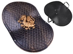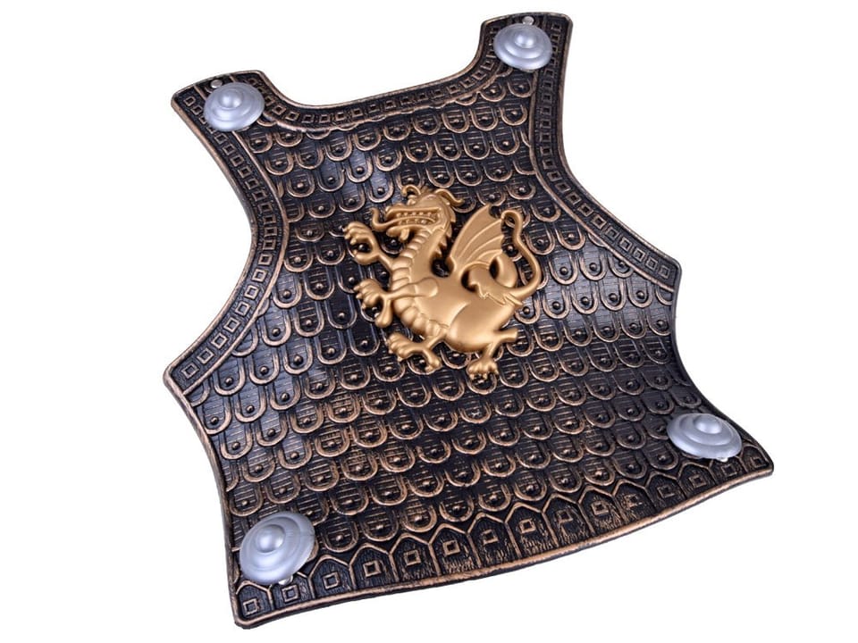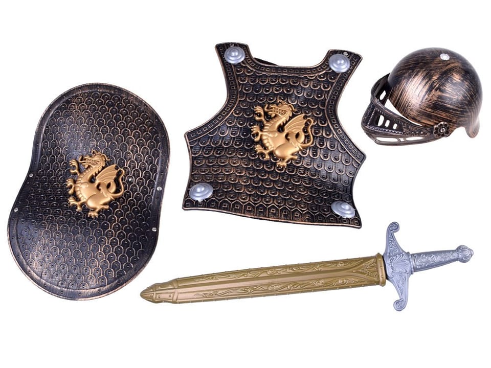 Zestaw zawiera:- zbroja- hełm z ruchomą zasłoną twarzy- tarcza- miecz z pochwąWymiary- miecz 56cm- zbroja 33cm x 35cm- hełm gł.ok. 13cm x śred. 19cm- tarcza 41cm x 28cmZbroja w całości wykonana z giętkiego plastiku, bezpieczna. Zbroja bardzo ładnie i starannie wykonana z herbem smoka.Elementy przeznaczone na klatkę piersiową są profesjonalnie wyprofilowane, tarcza także jest giętka przez co z łatwością nią się można osłaniać. Kolorystyka zbroi utrzymana w odcieniu starego złota. Na żywo prezentuje się bardzo okazale. Zestaw zapakowany w efektowne opakowanie idealnie na prezent.