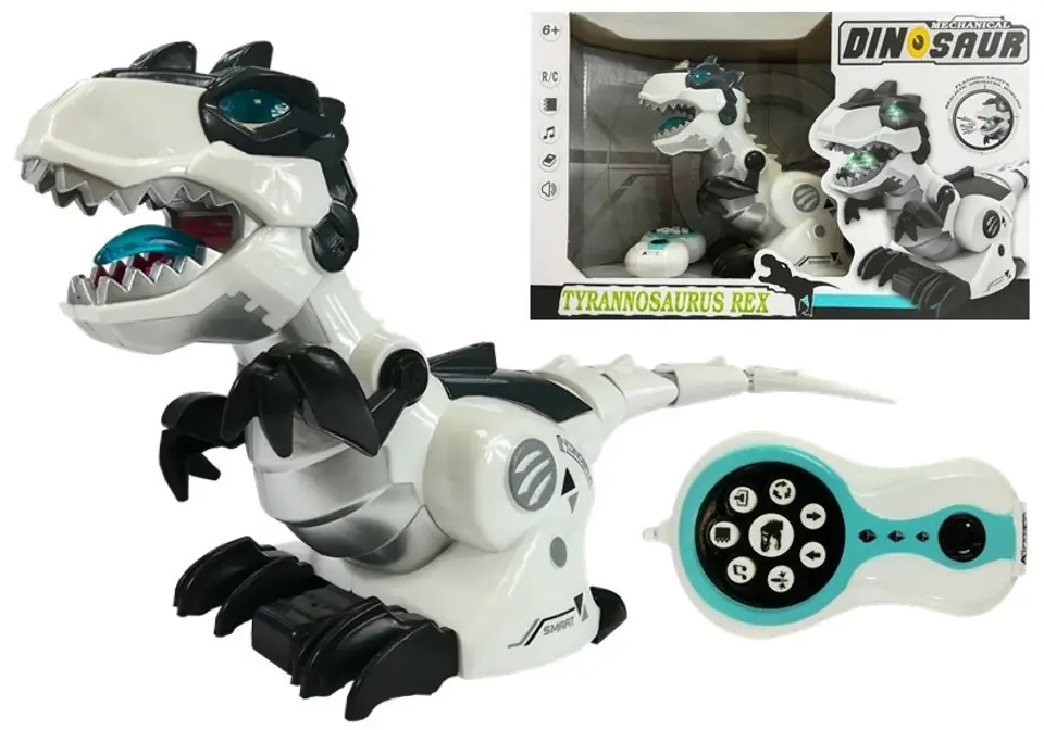 Ta interpretacja najbardziej popularnego z dinozaurów z pewnością zaciekawi niejednego młodego fana paleontologii. Zabawka wyposażona jest w świecące oczy oraz język, które świetnie prezentują się w ciemnościach. Dinozaur posiada także wbudowany głośnik, z którego wydobywają się realistyczne odgłosy dzikiej bestii. Mechaniczny T-Rex utrzymany jest w barwach białych oraz szarych, co nadaje mu nowoczesnego charakteru. Dzięki takiemu designowi daje się z łatwością zauważyć, że jest to zabawka interaktywna.
