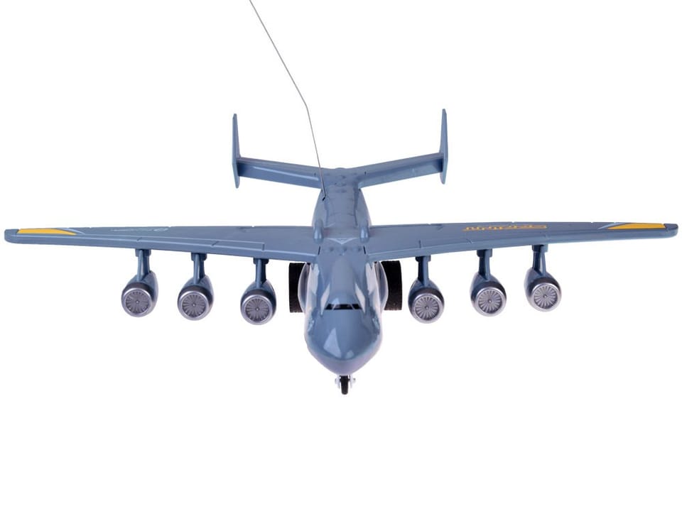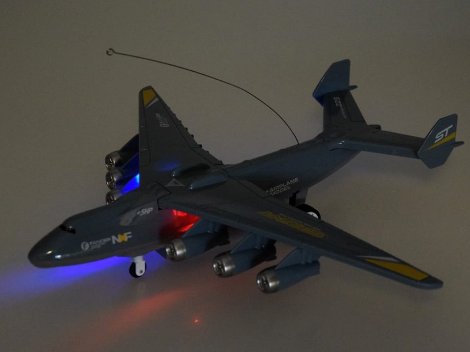Zdalnie sterowany samolot na pilota to propozycja dla każdego małego fana lotnictwa. Samolot sterowany jest za pomocą pilota, potrafi jeździć do przodu, tyłu, skręca w prawo i lewo. Zabawkowy samolot to wersja największego sześciosilnikowego samolotu transportowego Antonov 225. Ten niezwykły podniebny pojazd posiada efekty świetlne (czerwono - niebieskie), dzięki czemu zabawa będzie realistyczna i jeszcze bardziej urozmaicona. Zabawka świetnie sobie radzi jeżdżąc po płaskich powierzchniach. Samolot wykonany jest w całości z plastiku w szarej kolorystyce z zachowaniem detali Antonov 225, zaś koła samolotu gumowe.