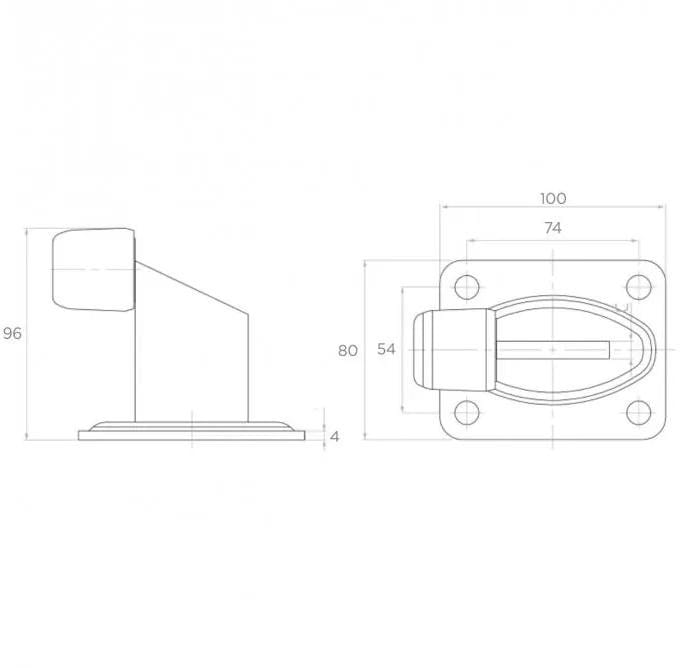 Odbojnik (zderzak, ogranicznik krańcowy, stoper) zewnętrzny z płytką, stosowany do bram przesuwnych (samonośnośnych i szynowych), skrzydłowych oraz podwieszanych, a także furtek. Mocowany do podłoża - posiada cztery otwory montażowe może zostać również przyspawany. W przypadku bramy rozwieranej można zastosować dwa zderzaki, osobno dla każdego skrzydła. Produkt jest ocynkowany, a gumowa nakładka chroni furtkę lub bramę przed uszkodzeniem. Posiada płytkę o wymiarach 100x80 mm.