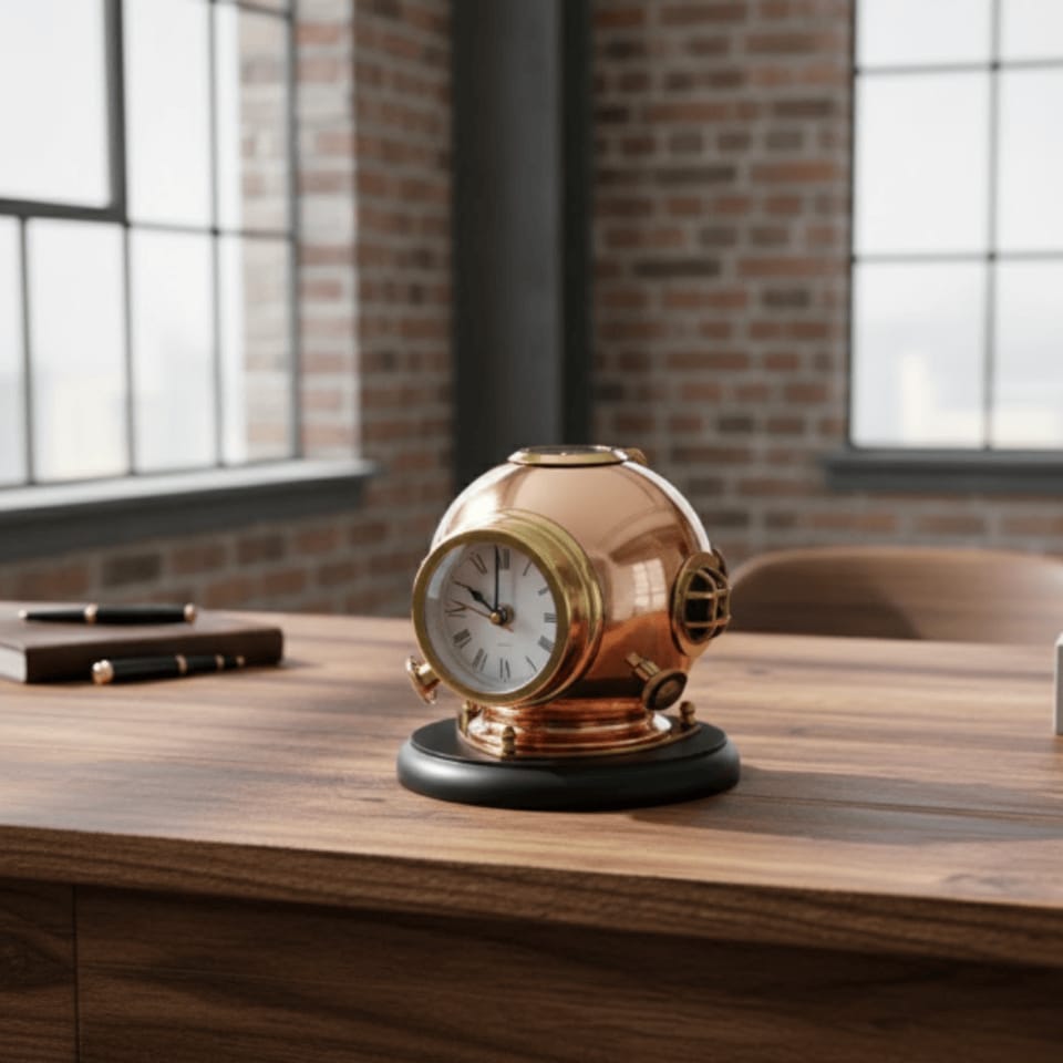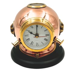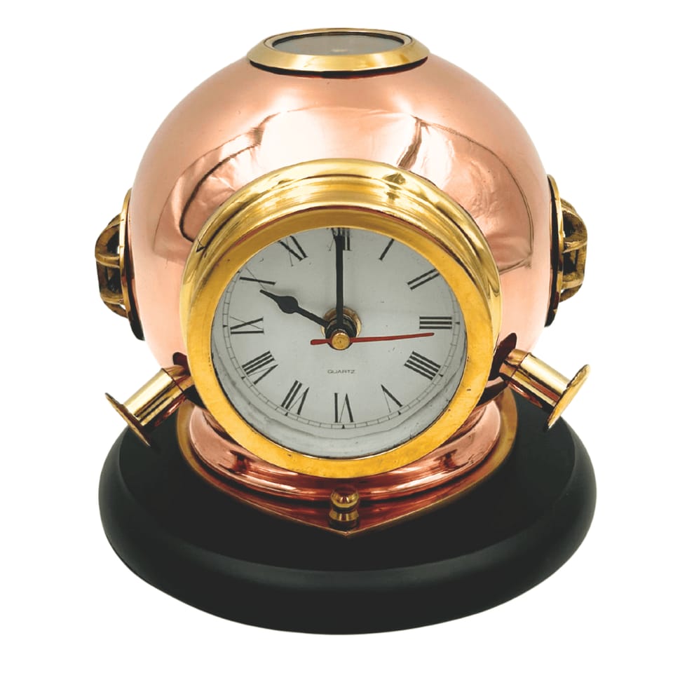 Zegar Biurkowy Hełm Nurka z Kompasem - Mosiężny na Drewnianej Podstawie – TC032