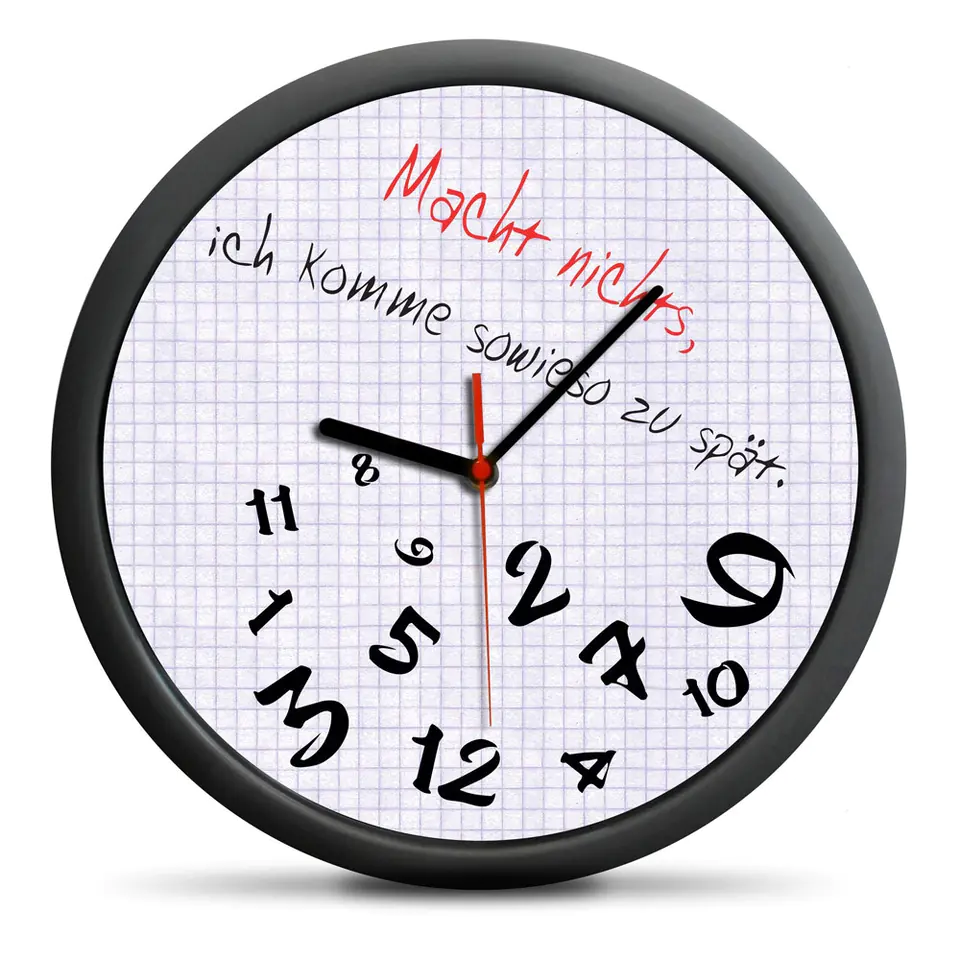 - Cichy, płynny, nietykający mechanizm zegara (tzw. zegar płynący). Pracuje bezgłośnie, nie rozprasza podczas pracy i zapewnia ciszę w czasie snu. Napis na produkcie: Macht nichts, ich komme sowieso zu spät. Produkt w niemieckiej wersji językowej. Materiał: ABS pokryty gumowaną powłoką, szklana szybka. Wymiary: 30 cm (średnica). OSTRZEŻENIA:Baterie