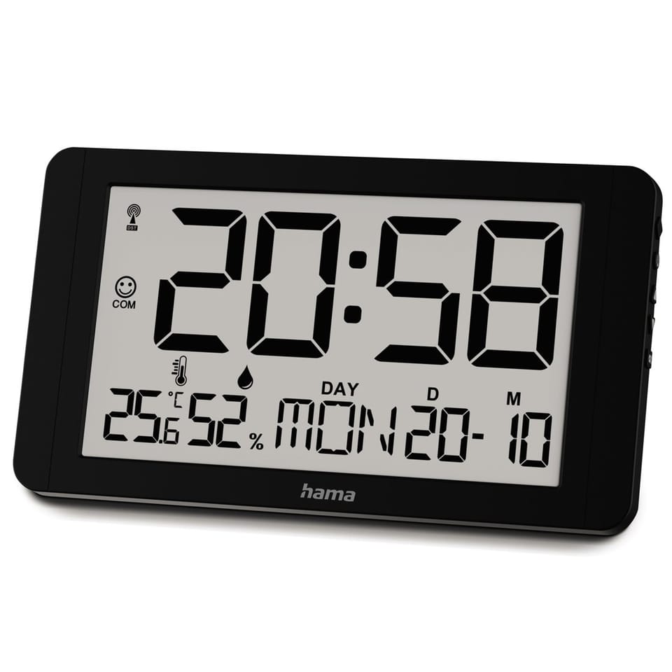 Twój dom, Twój czas, Twój komfortFunkcjonalności: Zegar sterowany radiowo automatycznie synchronizuje czas dzięki sygnałowi DCF, zapewniając niezrównaną precyzję Wyświetlacz cyfrowy prezentuje godzinę, datę, dzień tygodnia, temperaturę i wilgotność powietrza w jednym miejscu Składana podpórka pozwala na ustawienie zegara na stole lub wygodne powieszenie go na ścianie Termometr umożliwia wybór między jednostkami Celsjusza i Fahrenheita Wskaźnik komfortu klimatycznego szybko ocenia warunki w pomieszczeniu za pomocą prostych symboli Funkcja kalendarza i alarmu pozwala dostosować format czasu oraz język wyświetlania dnia tygodnia Ekologiczne opakowanie z certyfikatem FSC gwarantuje dbałość o środowiskoPrecyzja sterowana radiowoZegar "Hama Cuba" synchronizuje czas automatycznie dzięki sygnałowi DCF, pochodzącemu z najdokładniejszego zegara na świecie. Dzięki tej technologii masz pewność, że zawsze wyświetlana jest prawidłowa godzina, niezależnie od zmiany czasu. Funkcja ta sprawia, że codzienne korzystanie z zegara jest wyjątkowo wygodne.Czytelny i funkcjonalny wyświetlaczCzytelny ekran cyfrowy pozwala na łatwe odczytanie godziny, daty i dnia tygodnia. Minimalistyczny design wyświetlacza sprawia, że urządzenie pasuje do każdego wnętrza. To praktyczna opcja dla osób szukających eleganckiego i funkcjonalnego dodatku do domu lub biura.Zadbaj o komfort w swoim domuZintegrowany termometr i higrometr pozwalają na bieżąco monitorować temperaturę i wilgotność powietrza w pomieszczeniu. Wskaźnik komfortu klimatycznego, przedstawiony za pomocą symboli twarzy, szybko informuje, czy warunki w Twoim domu są optymalne. To świetne rozwiązanie dla Twojego zdrowia i samopoczucia.Uniwersalny montaż i elastyczne funkcjeZegar można zawiesić na ścianie lub ustawić na stole dzięki składanej podpórce. Dodatkowo ręczne ustawienie strefy czasowej pozwala na dostosowanie zegara do różnych lokalizacji. To idealne rozwiązanie zarówno do domowego użytku, jak i w biurze, gdzie liczy się precyzja i wygoda.Ekologiczne opakowanie Zegar "Hama Cuba" jest pakowany w materiały posiadające certyfikat FSC, co oznacza, że pochodzą one ze zrównoważonego leśnictwa. Wybierając ten produkt, wspierasz ochronę zasobów naturalnych i przyczyniasz się do zrównoważonego rozwoju. Hama to nie tylko jakość, ale także troska o planetę.Specyfikacja: Kolor obudowy: Czarny Model: Zegar ścienny Wyświetlacz: Cyfrowy Higrometr (20% do 95%) Termometr (-10°C do +50°C) Szerokość: 25 cm Waga: 388 g Liczba baterii: 2 Typ baterii: AA Mignon