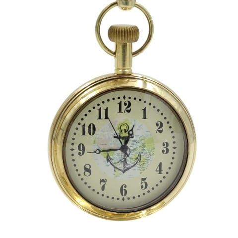 Marynistyczny zegar mosiężny na zawiesiu NC2126 Kotwica wpisana w mapę świata na tarczy zegara, piękny żaglowiec na odwrocie. WYMIARY: wys. 12cm, szr. 9,5cm, średniaca zegara 5,5cm Napęd: bateria elektroniczna Nadaje sie do grawerowania. Wspaniały prezemt dla marynarza czy miłośnika żeglarstwa